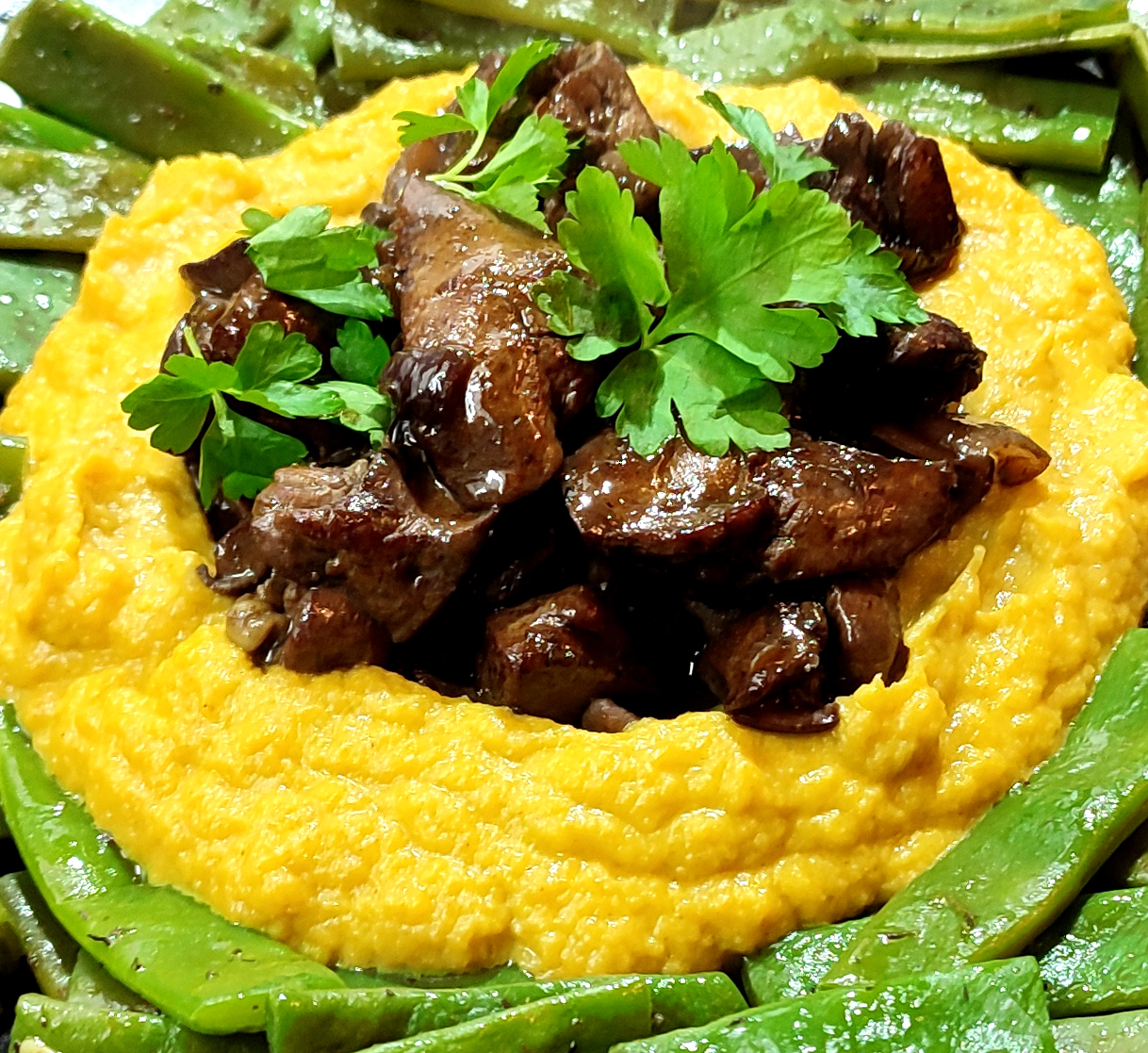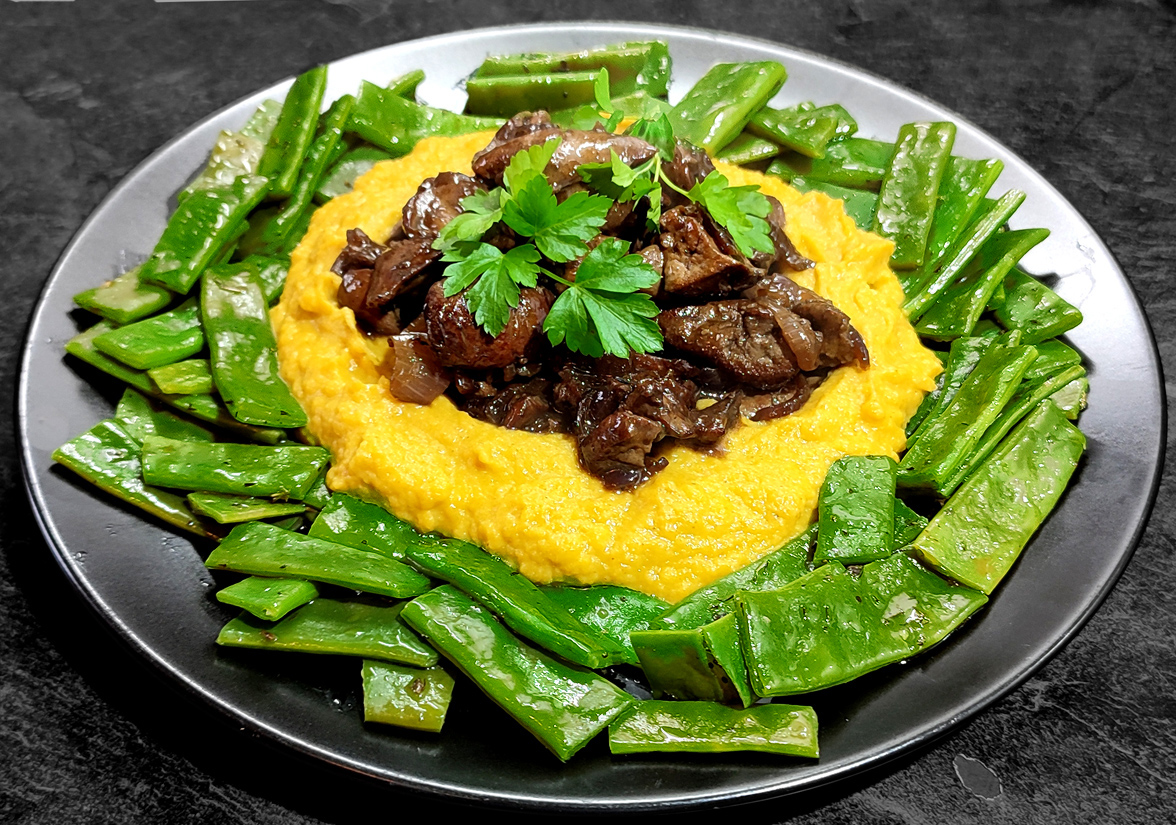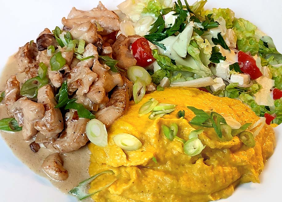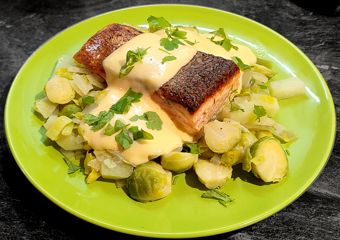 Das Gemüse kommt aus der Tiefkühltruhe. Ich hatte es halb gar blanchiert und weggefroren. Blumenkohl und Broccoli sind so schnell gar gekocht, abgegossen, ausgedünstet, püriert und mit Butter, Frischkäse, Muskat und Salz verfeinert und sogleich püriert.
