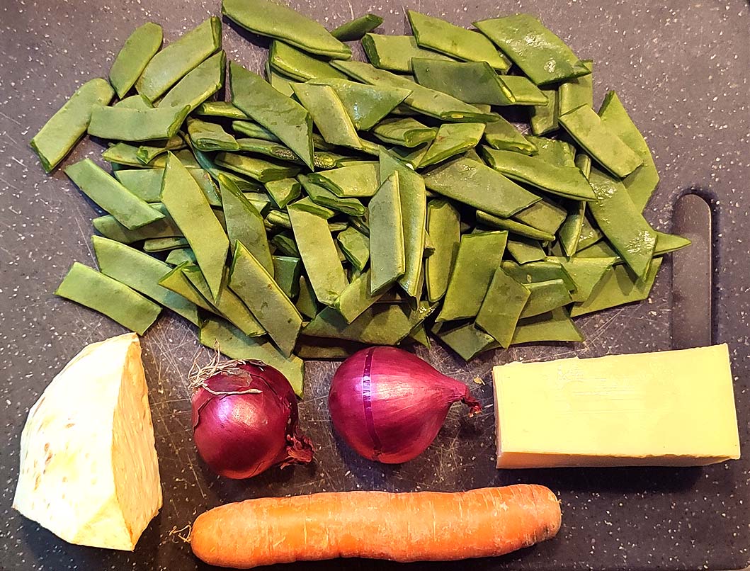 Na, da köchelt es schon munter. Im Hintergrund warten die Eier auf ihr Wasserbad, vorne links bereiten sich Blumenkohl und Broccoli aufs Püree vor und vorne rechts gibt es ordentlich Zwiebeln und Speck an die Bohnen.
