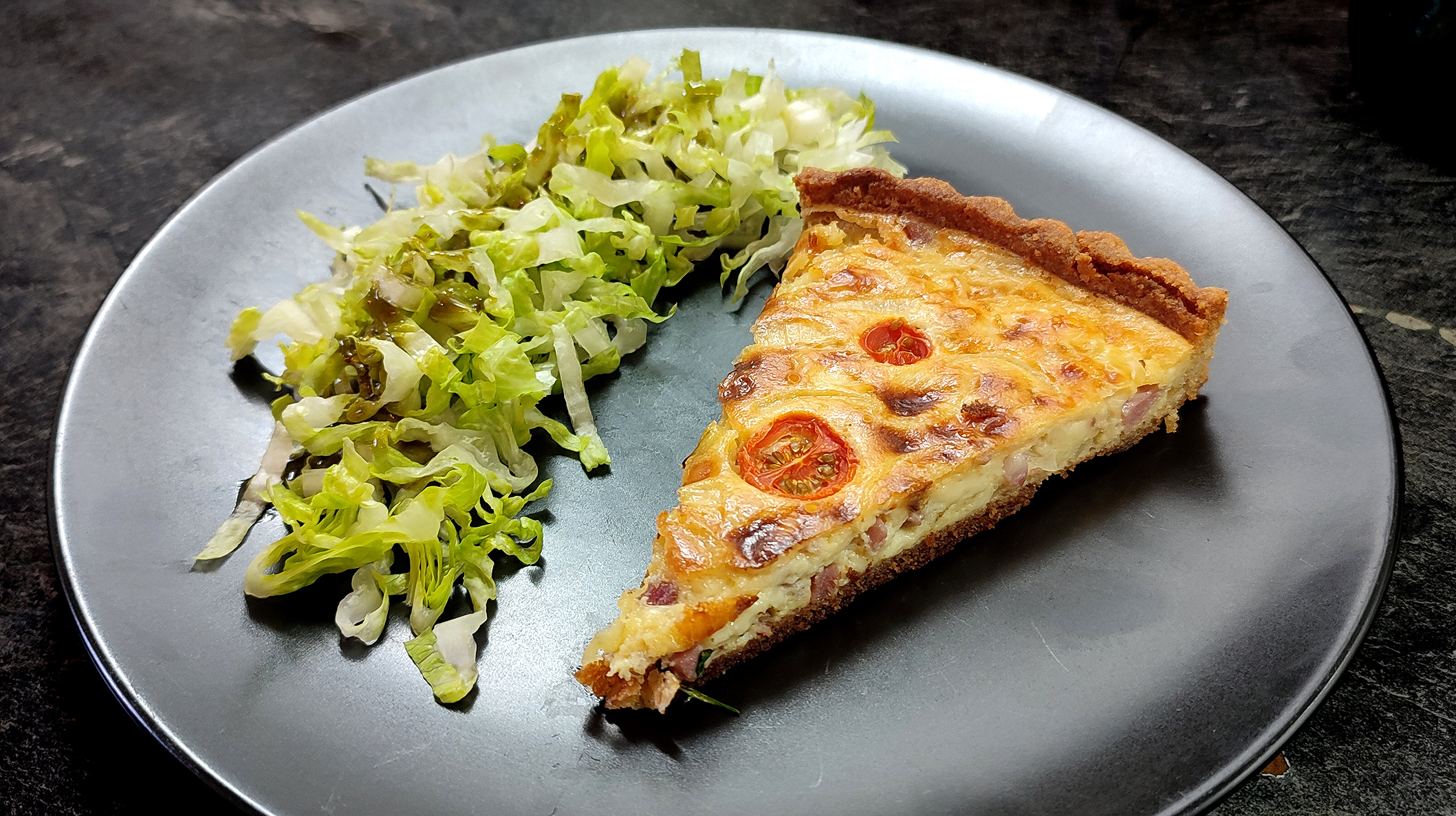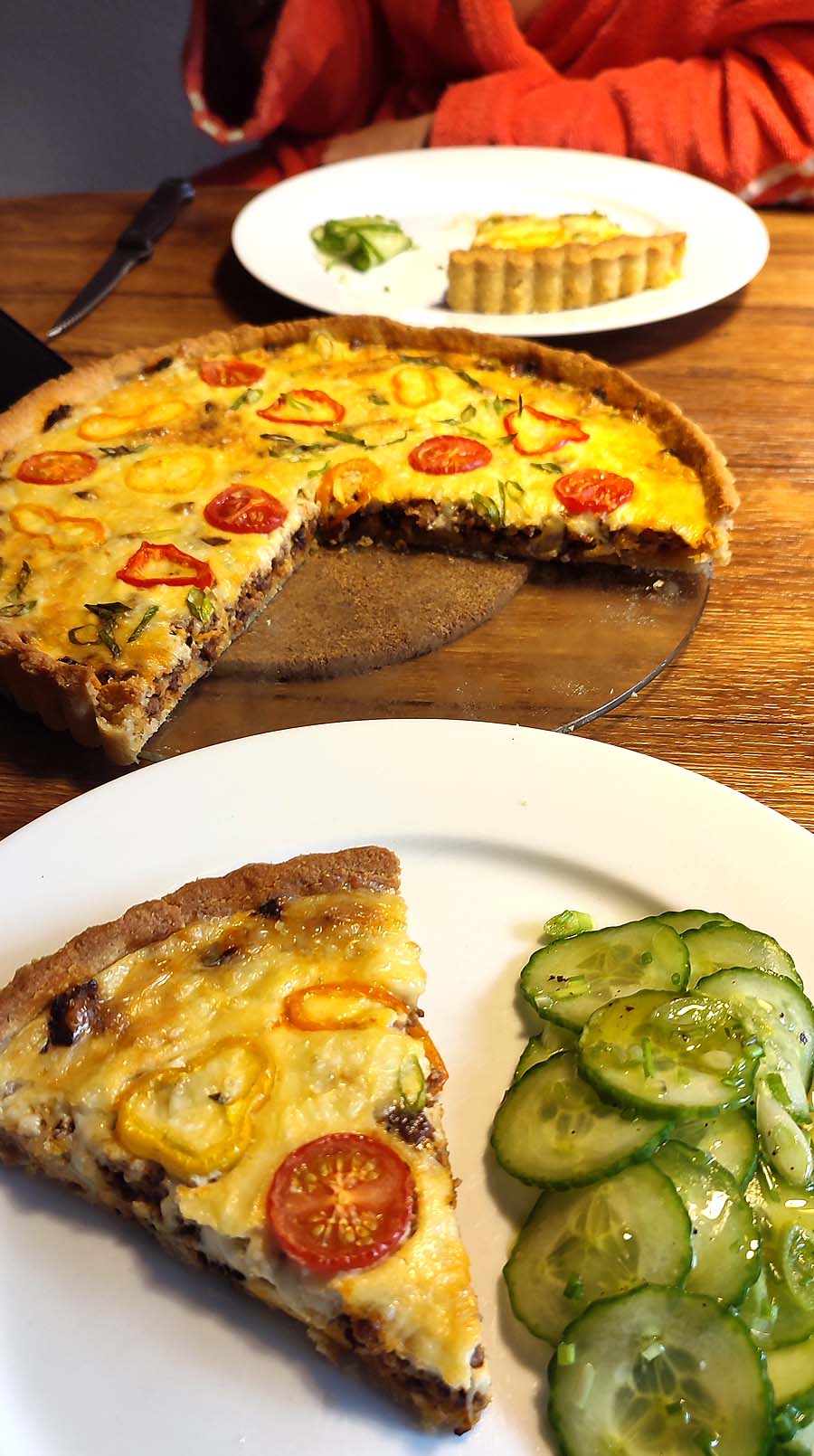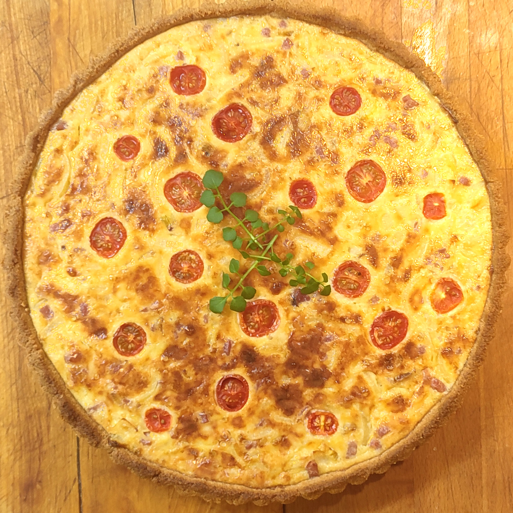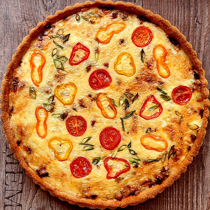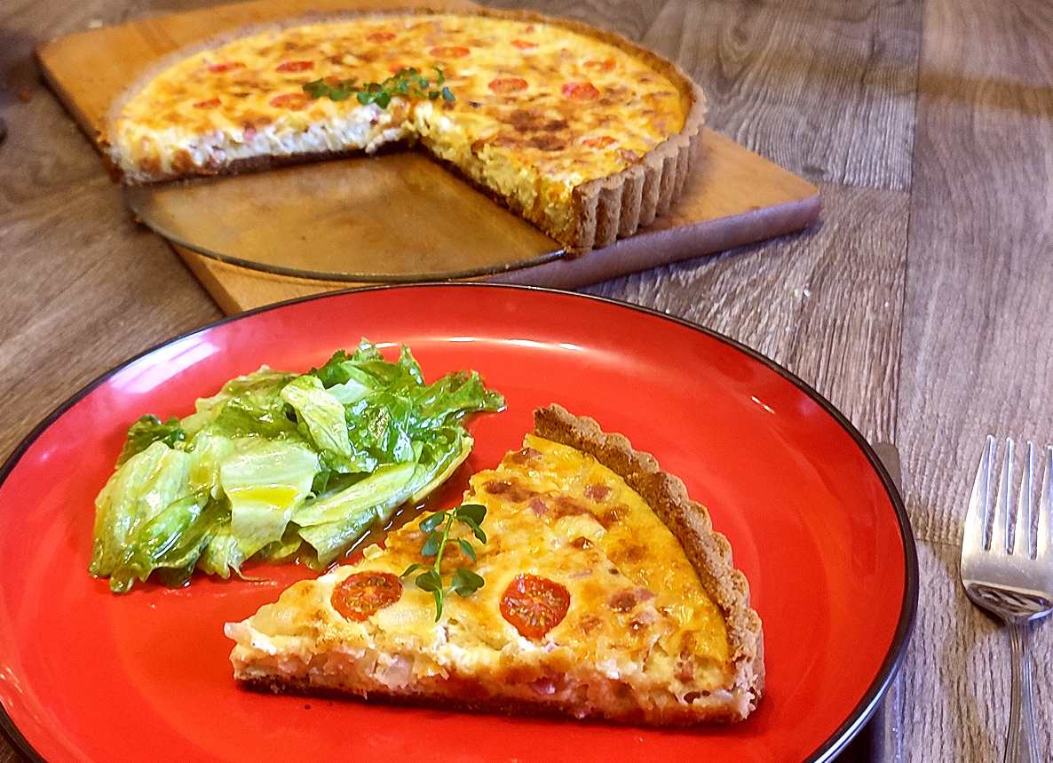 zusammengeknetet und in eine Quicheform gestrichen. Den Boden backe ich dann „blind“ 10 Minuten bei 180° nur mit Unterhitze und weitere 10 Minuten mit Ober- und Unterhitze. Am besten nach Augenmaß, leicht gebräunt.