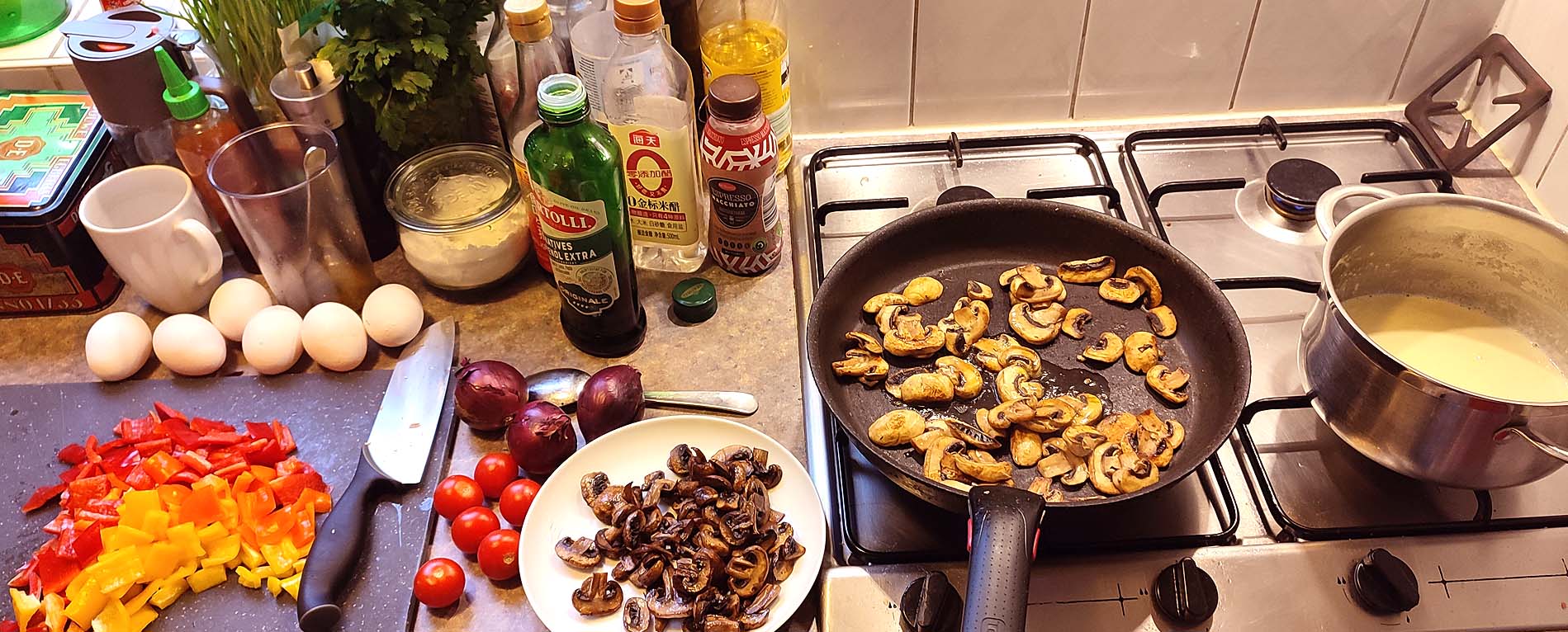 Beim Campinggeschirr habe ich das Glück einer quadratischen Pfanne und diese eignet sich hervorragend für die gefüllte Käse-Ei-Roulade. Es sollte aber auch in einer großen normalen Pfanne gehen, stutzt man die Ingredienzien etwas quadratisch zurecht.