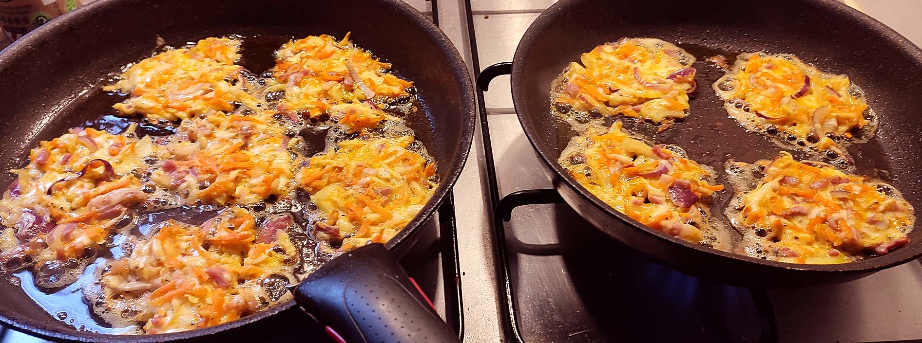 Ist alles verrührt, dann darf der Teig noch etwas ruhen, auf dass die Flöhe quellen. In mittelheißem Olivenöl backe ich die Rösti von beiden Seiten aus.