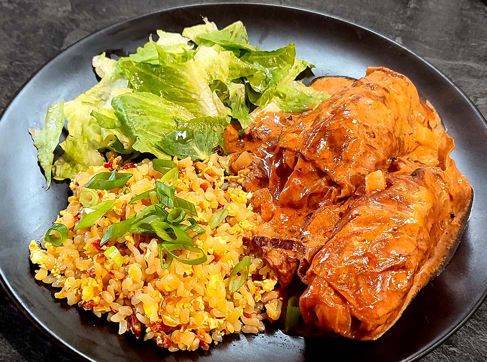 Heute habe ich die grob gewürfelte Aubergine mit den Schmor-Tomätchen und Hackfleischbällchen (das schon gewürzte Hackfleisch hatte ich noch von den Frikas, siehe unten, zurückgehalten) zusammen gebraten und das Paprika-Tomaten-Zwiebel-Gemüse mit etwas Tomatenmark, schön spicy mit Chili gewürzt, sowie mit Allulose, Pfeffer und Salz abgeschmeckt, separiert gekocht.