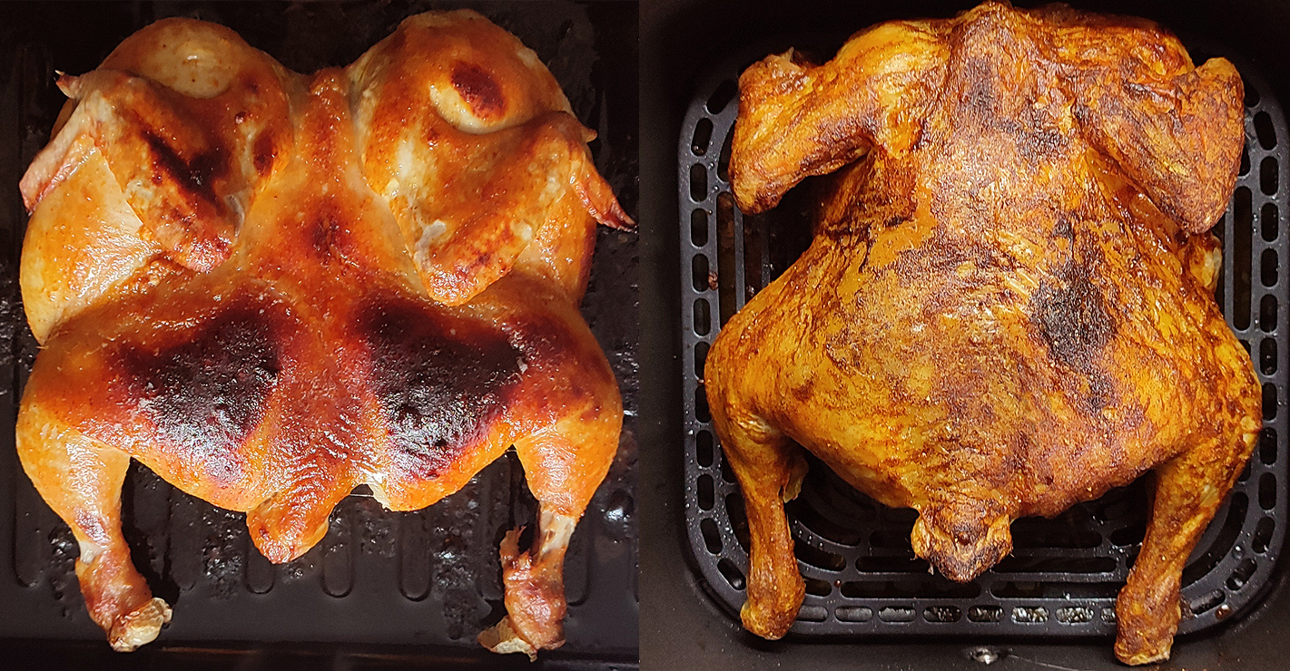 Die Spitzpaprikas kommen als erstes in die Heißluftfritteuse oder bei dem, der die nicht hat, in den Ofen. In der HLF rösten sie mit 195° 10 Minuten von der einen und noch einmal 10 Minuten von der anderen Seite. Im Backofen dauert es länger. Die Haut darf ruhig an vielen Stellen schon schwarz werden.