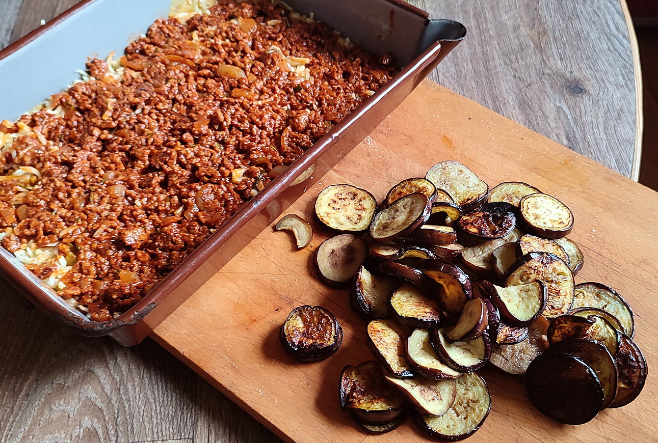 Die Auberginenscheiben habe ich scharf in viel Olivenöl angebraten. Heute dürfen sie sich eifrig vollsaugen und dunkelstbraun backen.