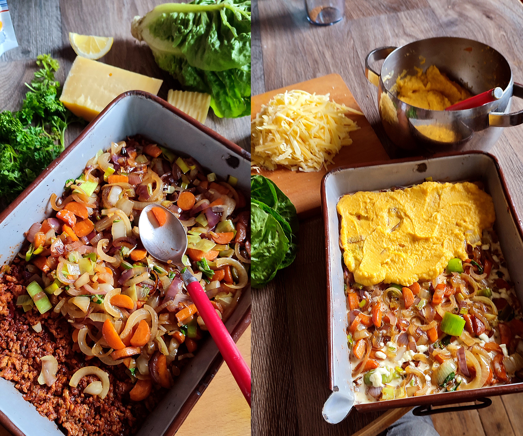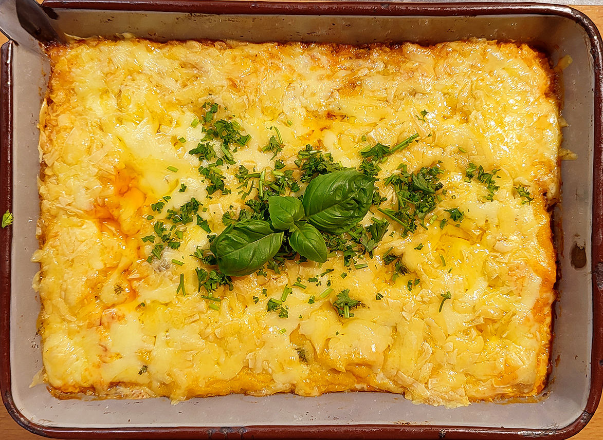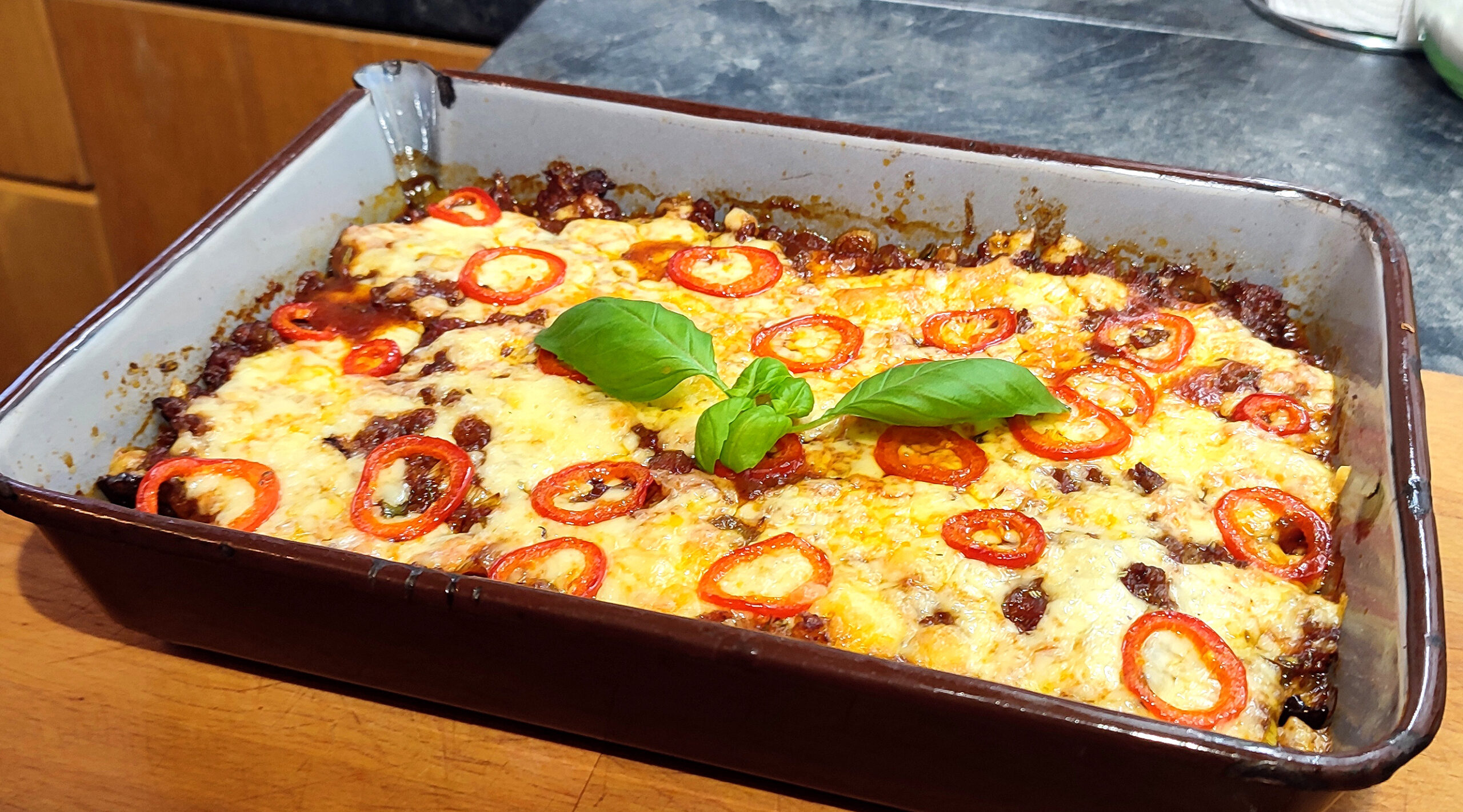 Und das war’s auch schon, die Freunde mögen kommen. Wie beschrieben: fünf Minuten vorher den Teig zu Ende backen, dann befüllen und für eine halbe Stunde in den Ofen. Für die Farbe dann eventuell noch etwas grillen. Ganz nach Belieben.