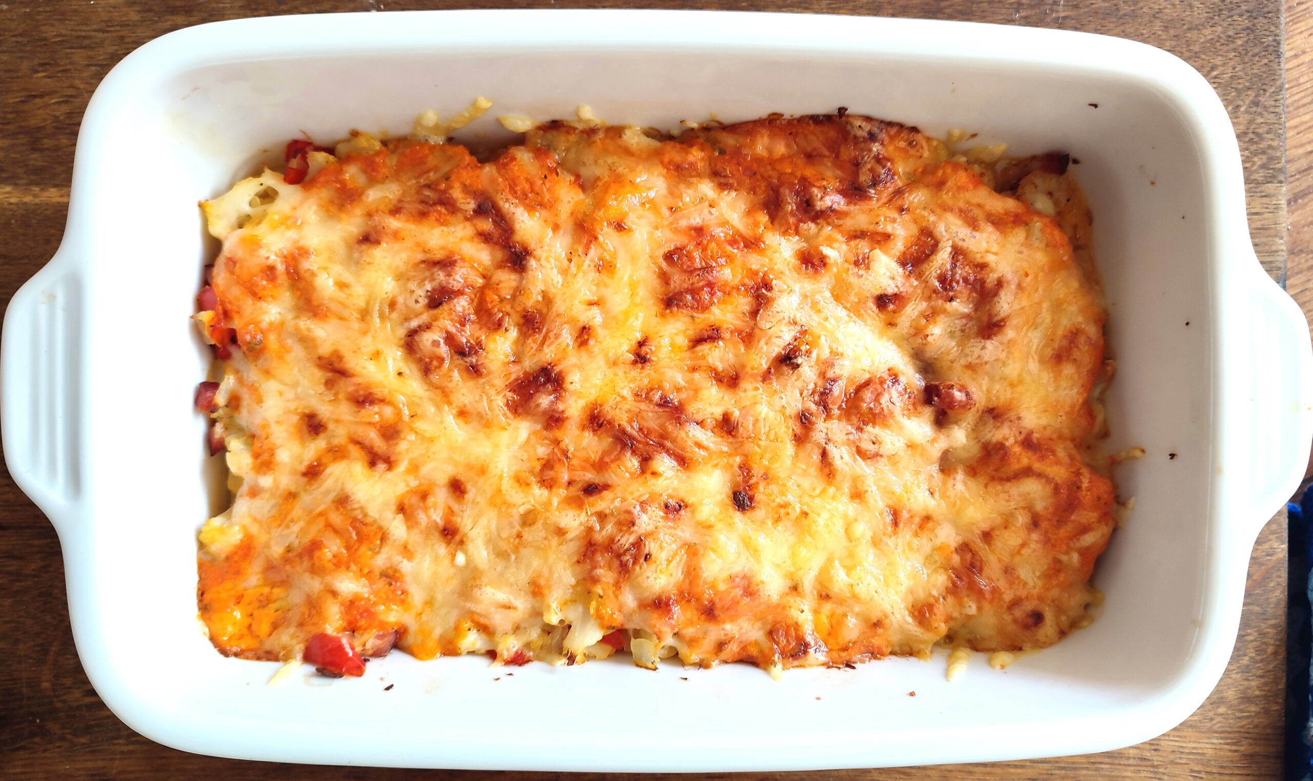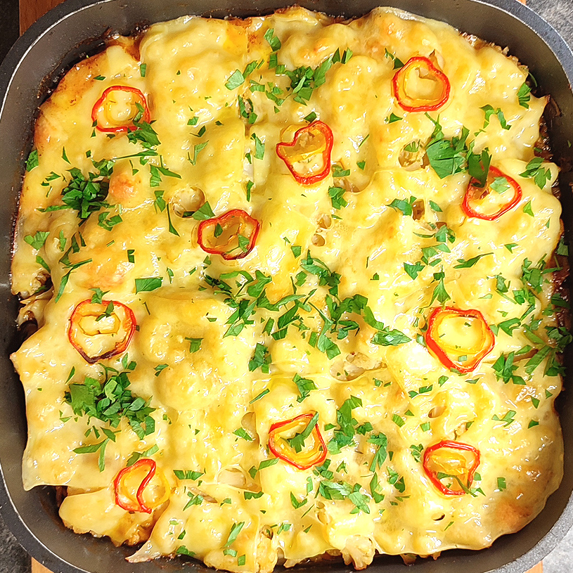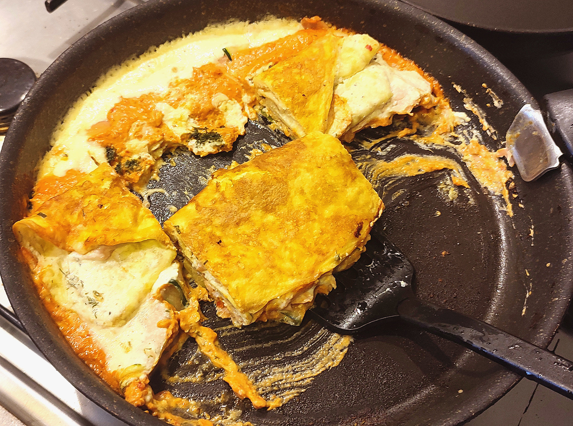 Und das war’s auch schon, die Freunde mögen kommen. Wie beschrieben: fünf Minuten vorher den Teig zu Ende backen, dann befüllen und für eine halbe Stunde in den Ofen. Für die Farbe dann eventuell noch etwas grillen. Ganz nach Belieben.