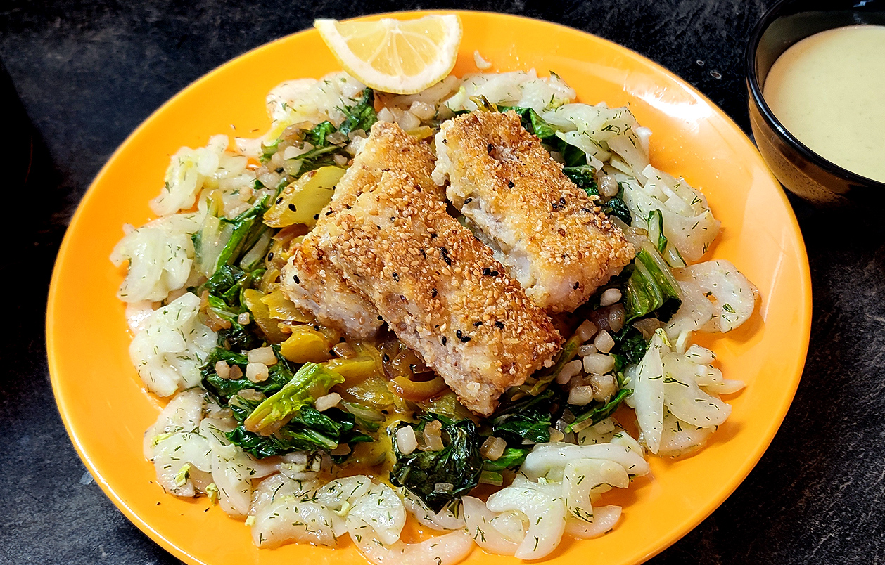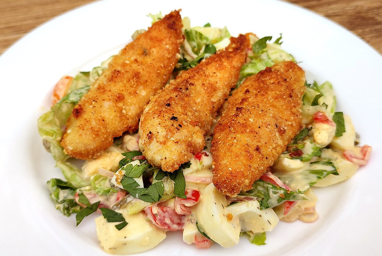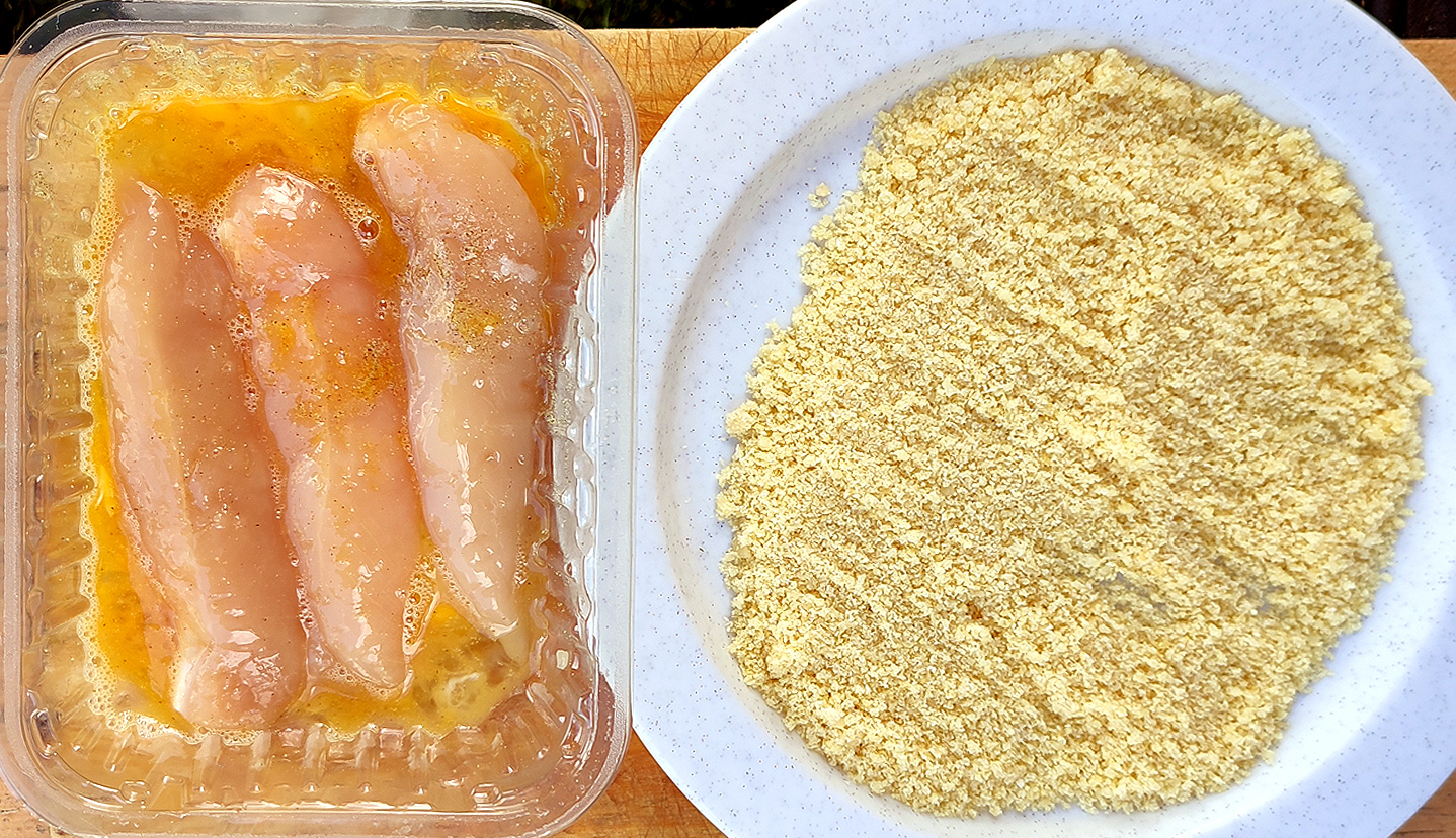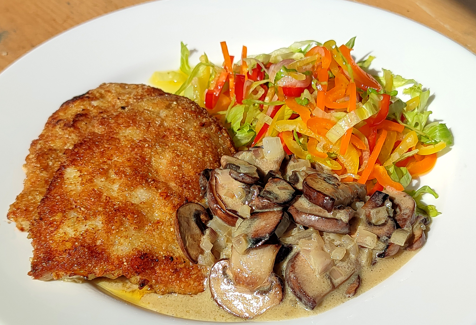Einmal ins Ei, dann in die Panadenmischung und ab in die heiße vorgeheizte Bratpfanne. Zwei Minuten von jeder Seite oder einfach so lange, bis die Panierung den gewünschten Bräunungsgrad hat.