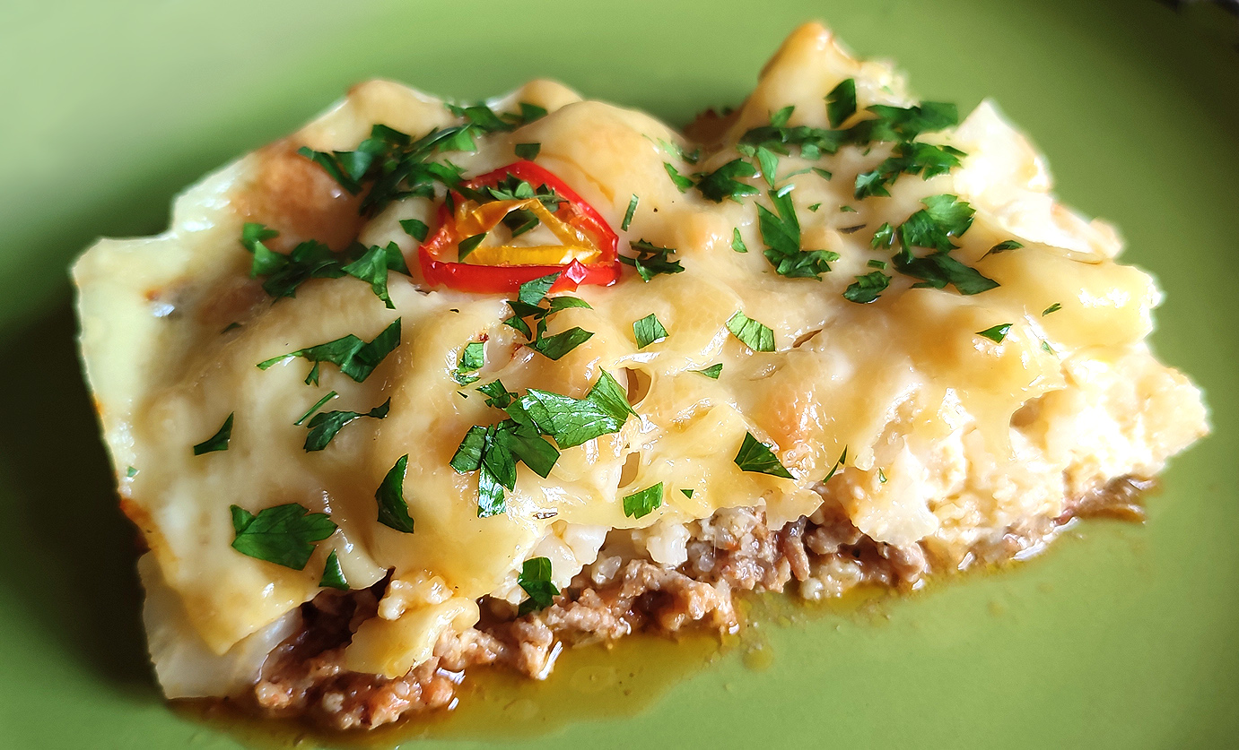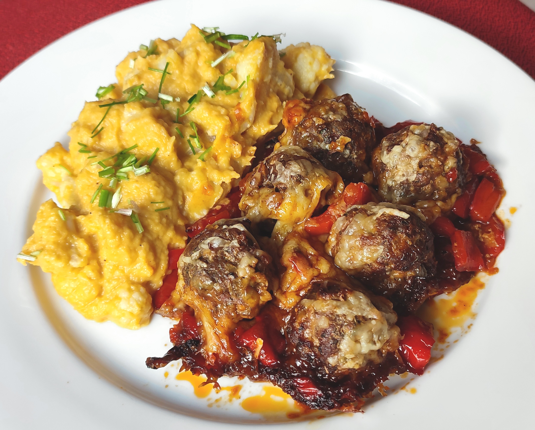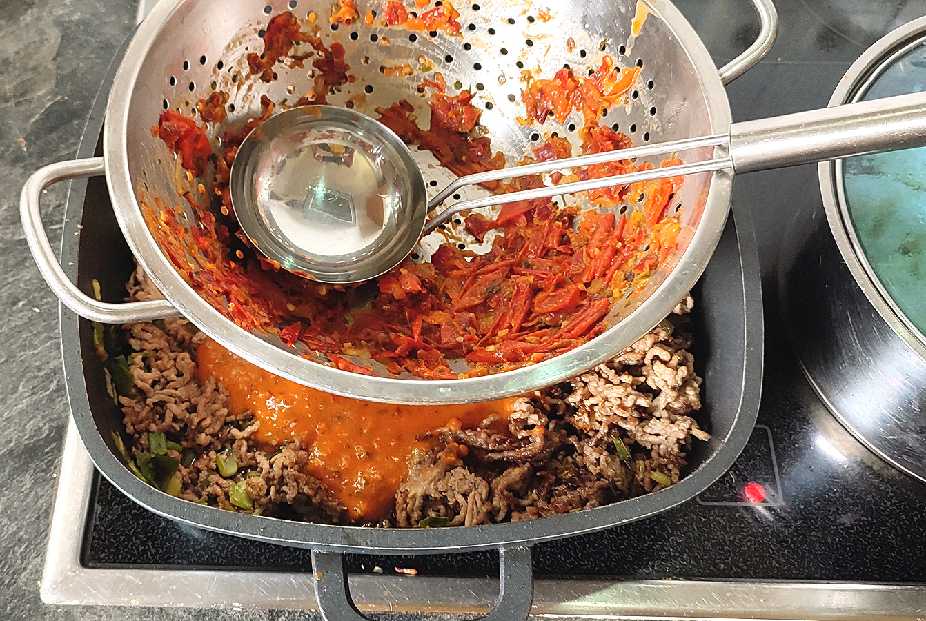 Wie fertig? Ich komme da in Schwierigkeiten, denn das ist nicht meine Koche und ich muss zweimal nachfragen: „Wie jetzt, das Hack nicht anbraten … die Paprika roh … nichemal Zwiebeln?“