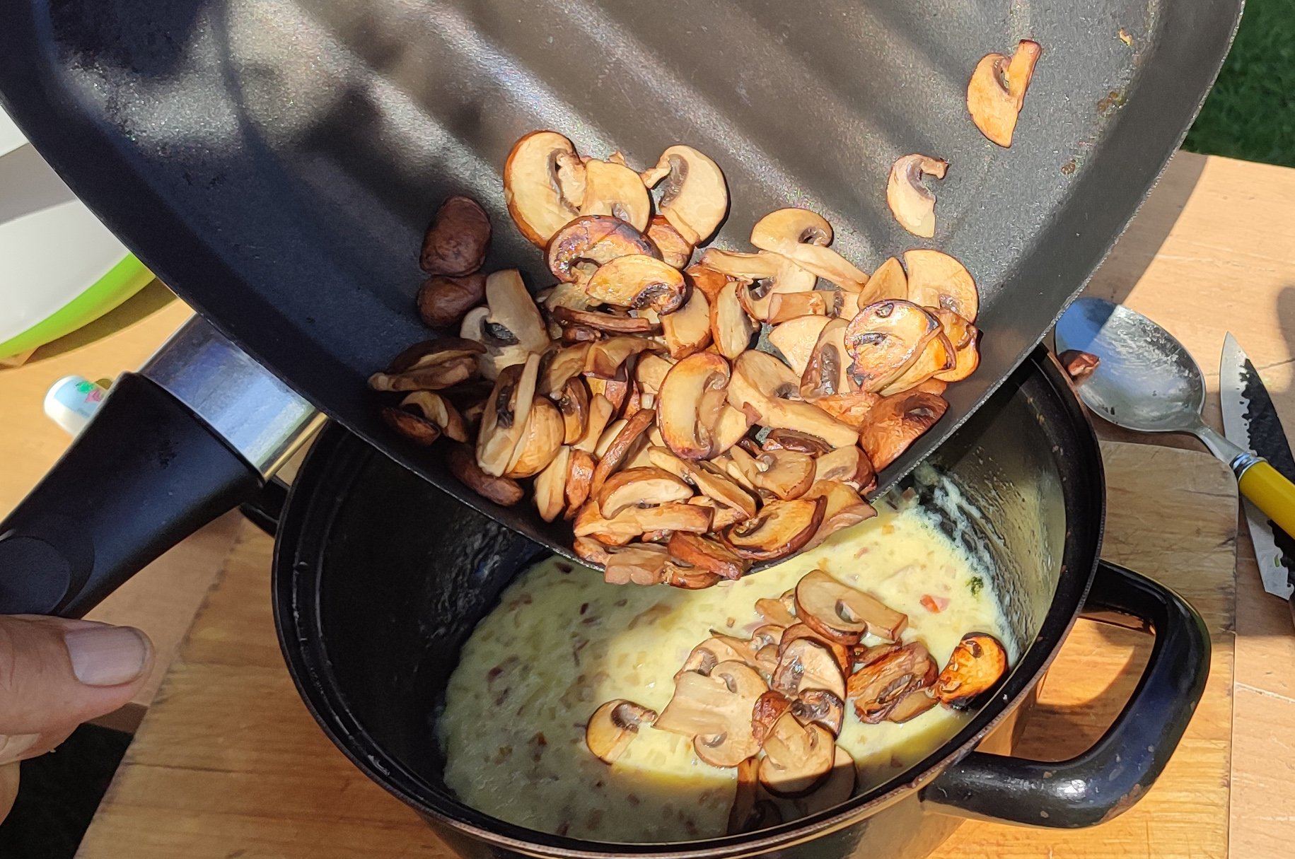 Nicht zwingend, hatte ich noch getrocknete Shitakepilze, die ich kleingehackt und eingeweicht, mit zu den Champignons getan habe.
