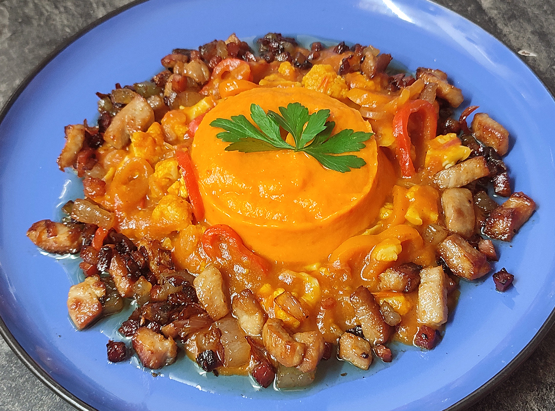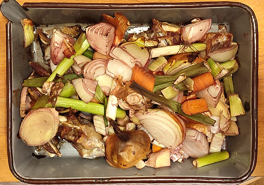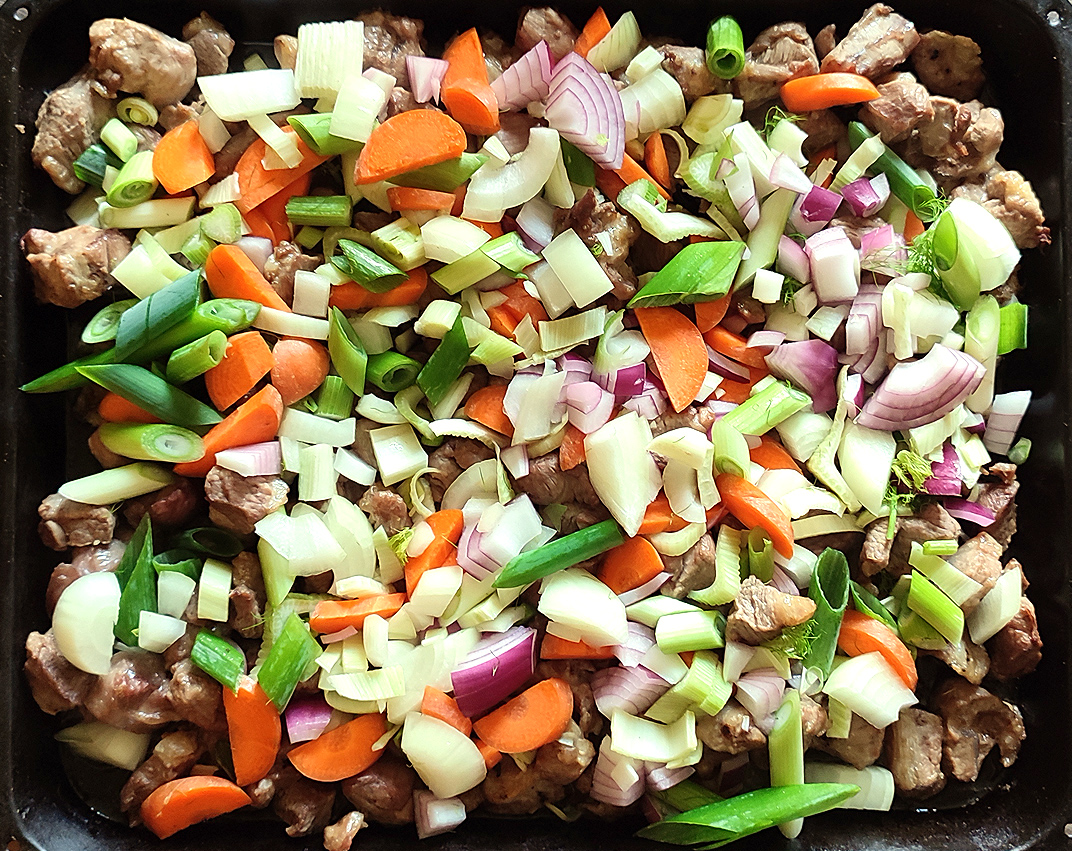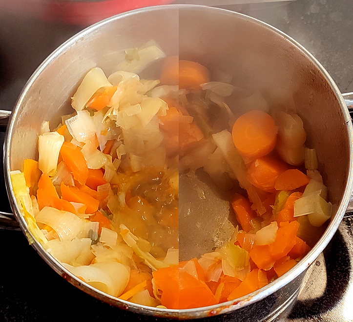 grob zerkleinern und mit wenig Wasser aufsetzen. Ist das Gemüse weich, gieße ich den Rest Wasser ab, ziehe das Gemüse am Topfrand hoch und lasse es auf der Platte ausdünsten. Jetzt kommen dazu: