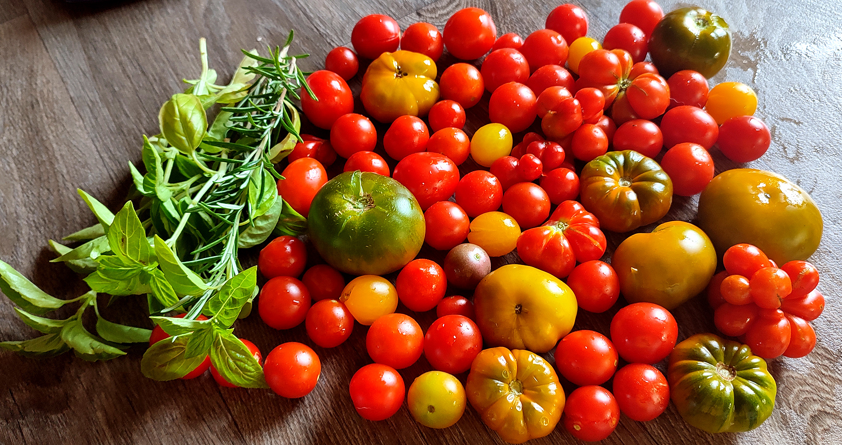 Die geht dann in die Auflaufform, der Ziegenkäse wird drübergekrümelt, die letzten Cocktailtomaten und etwas Sumac krönen das einfache Gericht. Nochmal etwas Olivenöl drübergesprüht und ab in den Ofen.