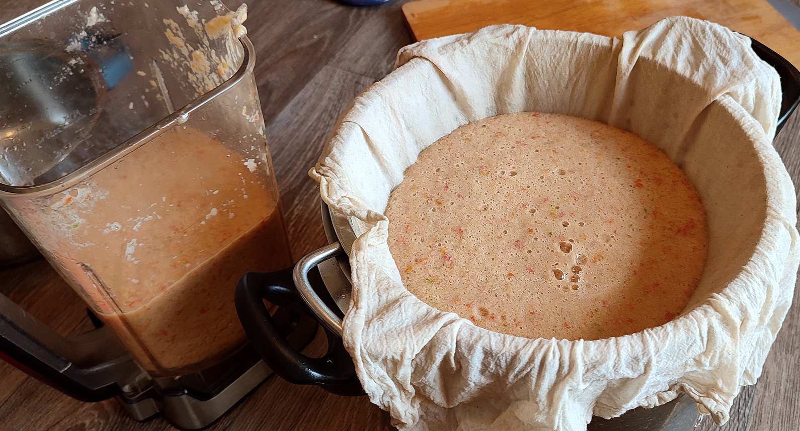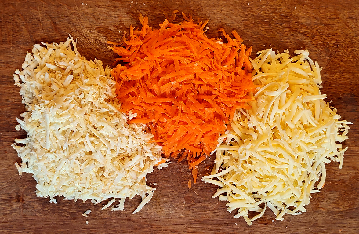 Pastinaken und Möhren grob raspeln, salzen und zwischen Küchenkrepp entwässern. Noch einmal eine gleiche Menge Gouda raspeln und nach einer halben Stunde alle Zutaten vereinen.