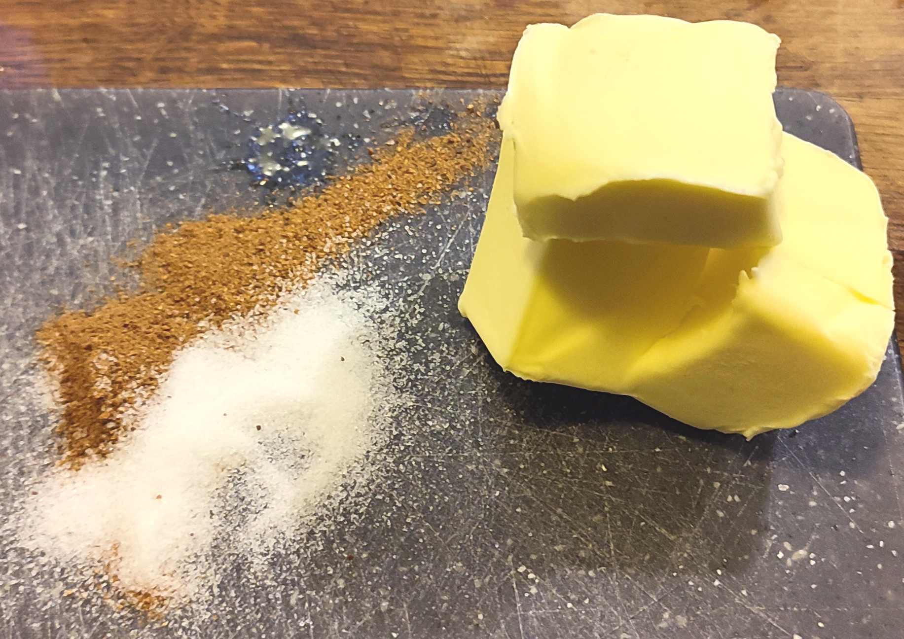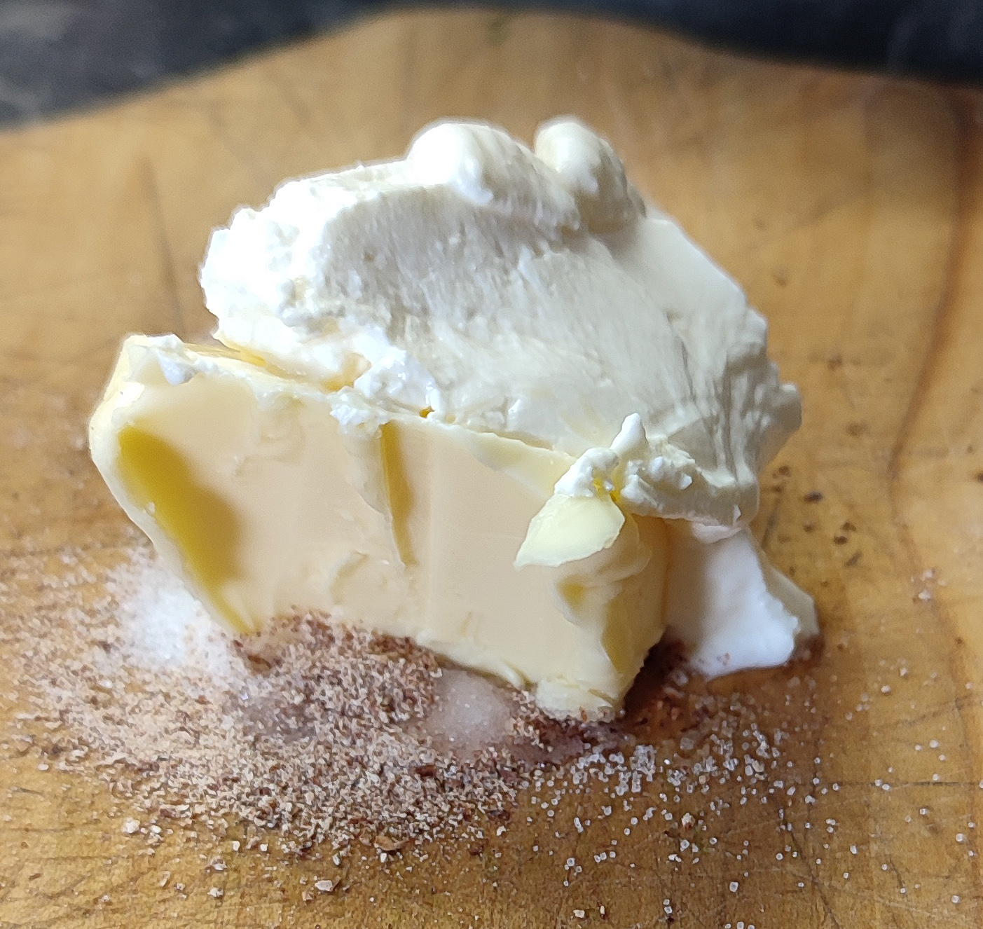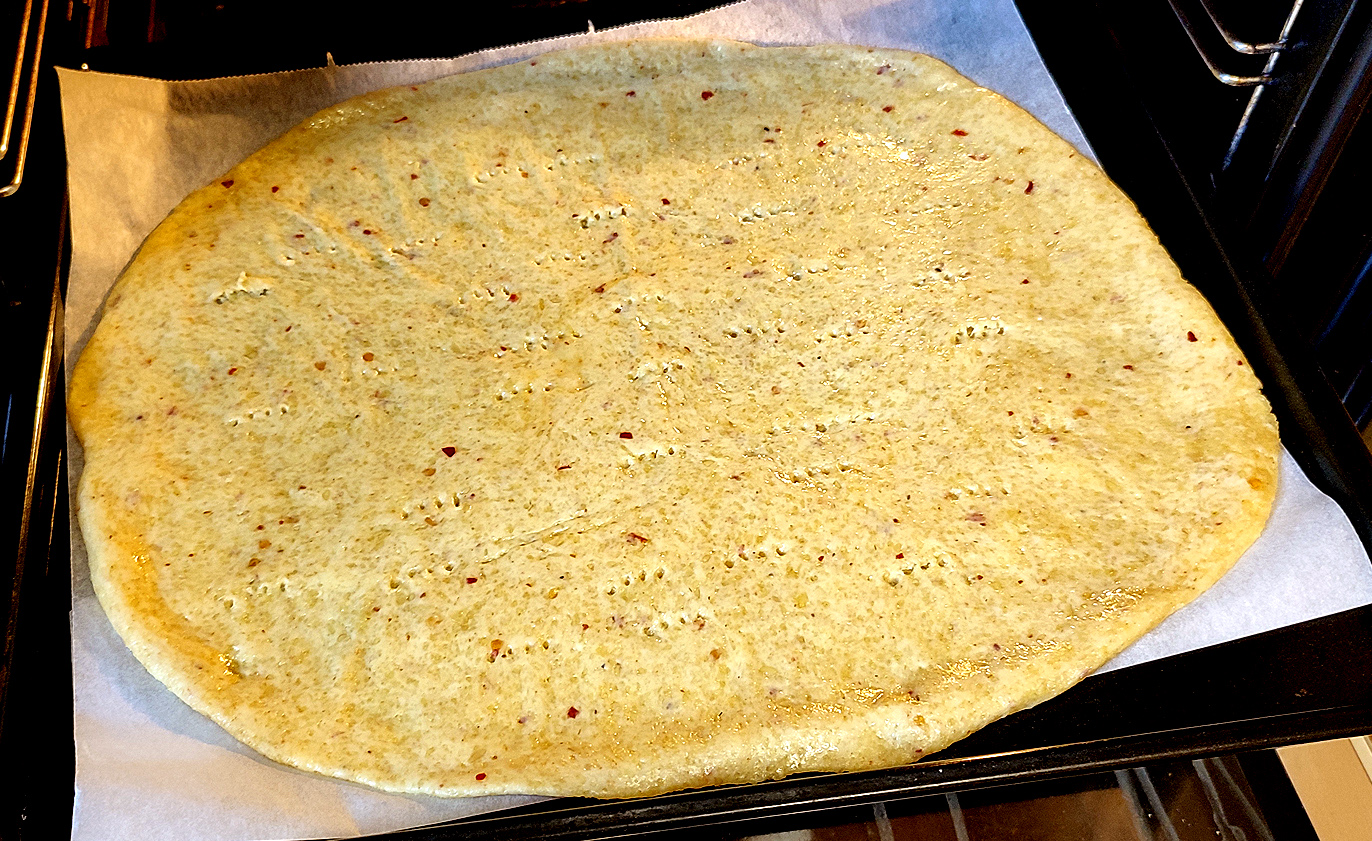 Zuvor aber kommt er aufs Blech, wird butterbeflockt und allerfeinst bewürzt.