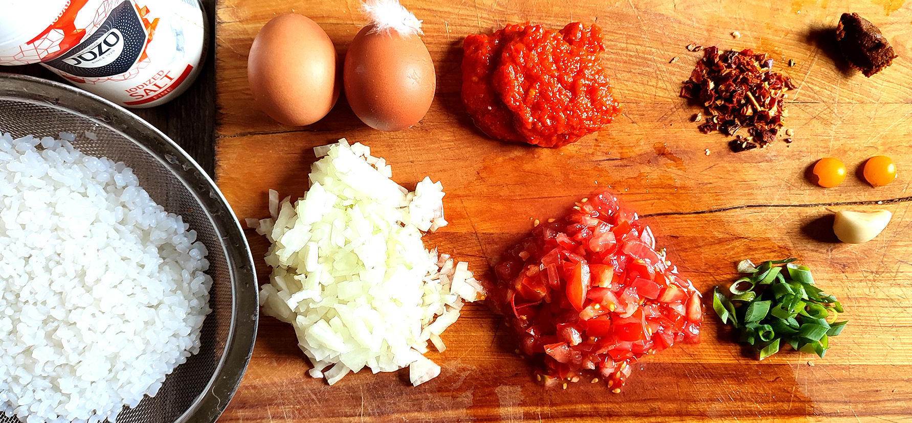 Zwiebeln und Speck anbraten, Konjakreis gut durchspülen und dazugeben. Ein Ei hinein schlagen und unter rühren krümelig braten. Abschmecken.