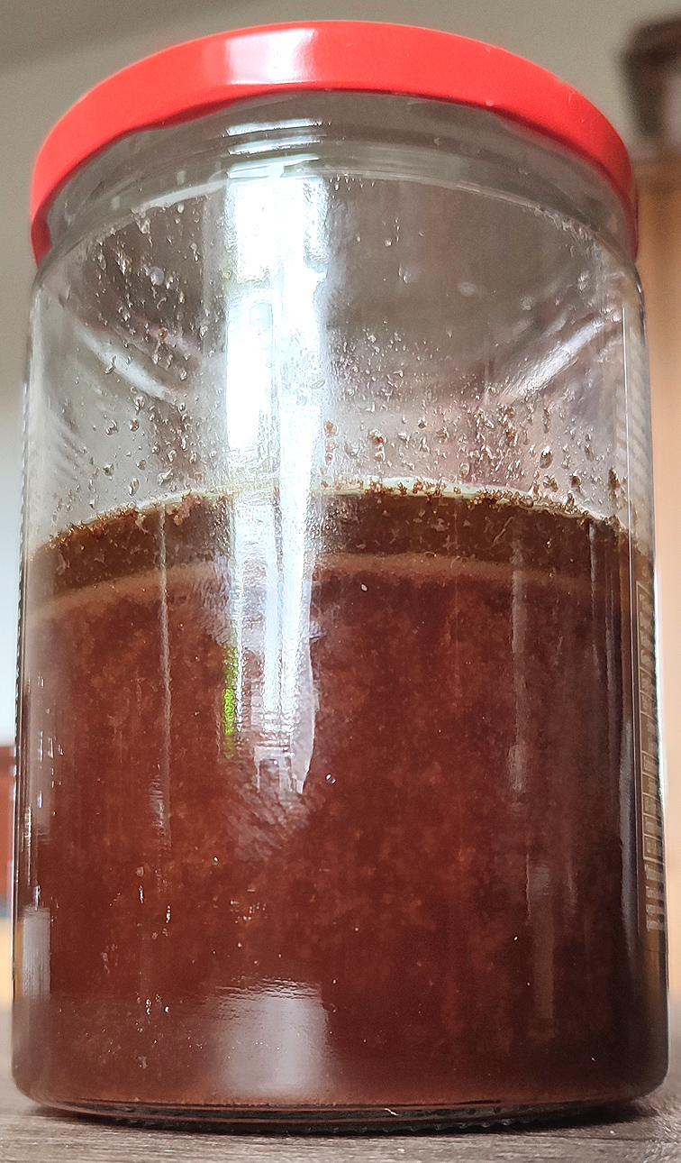Der Einfachheit halber nehme ich eingelegte rote Jalapeños aus dem Glas, lasse sie gut abtropfen und habe gleich den Essig gespart. Knoblauchzehen nach Belieben und an die Mengen von Süßungsmittel sowie Salz taste ich mich nach und nach heran.