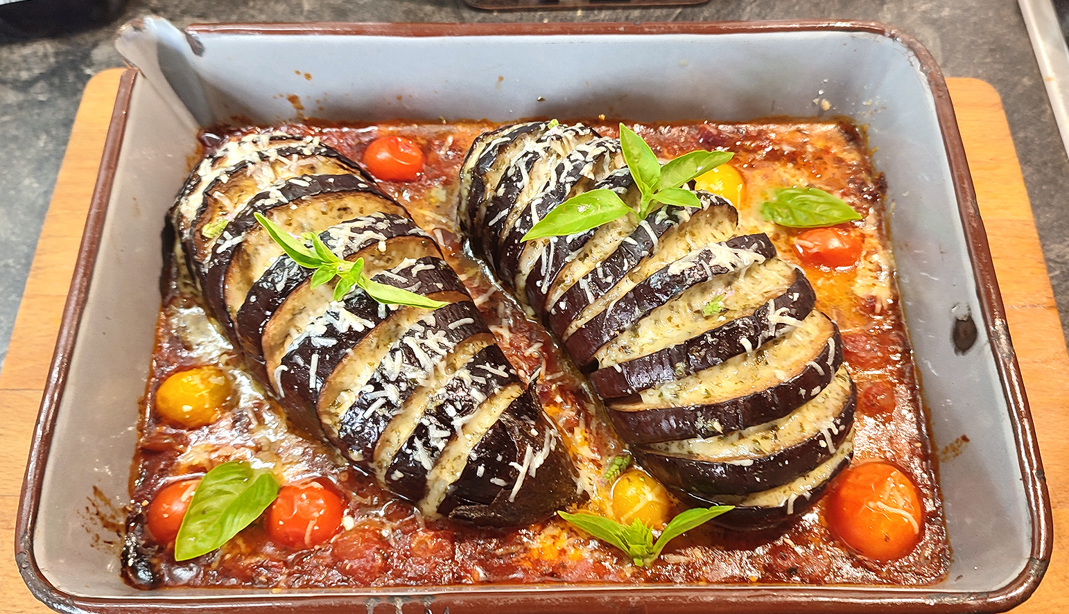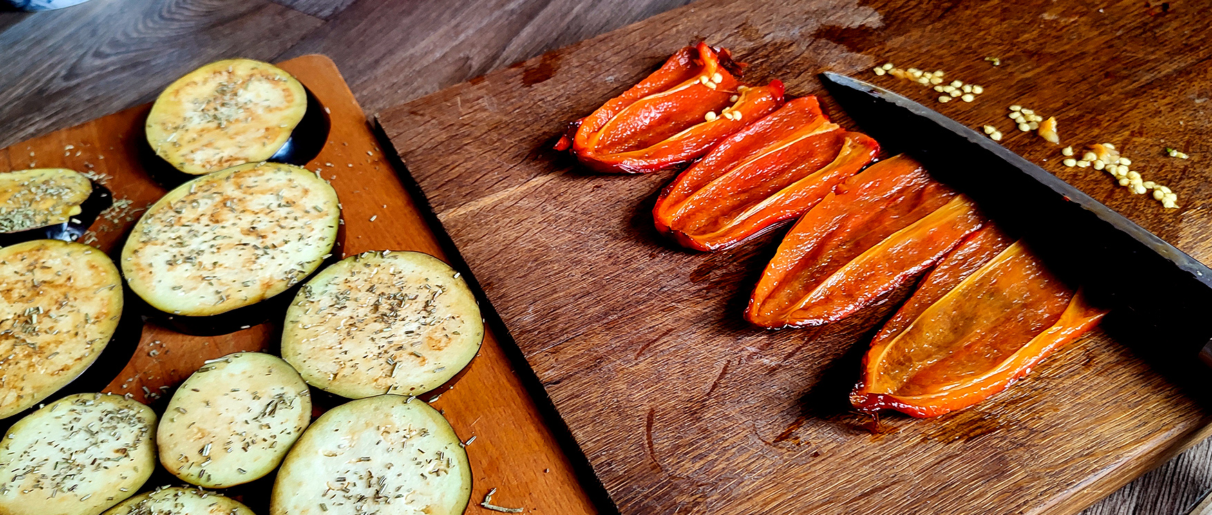 Den Auberginen schneide ich die vordere Kappe weg und ihre Schale 5 mal längs und nicht sehr tief ein. Der Strunk bleibt dran! Dann bekommen sie die letzte Olivenölung und wandern für 35 Minuten bei 180° in den Ofen.