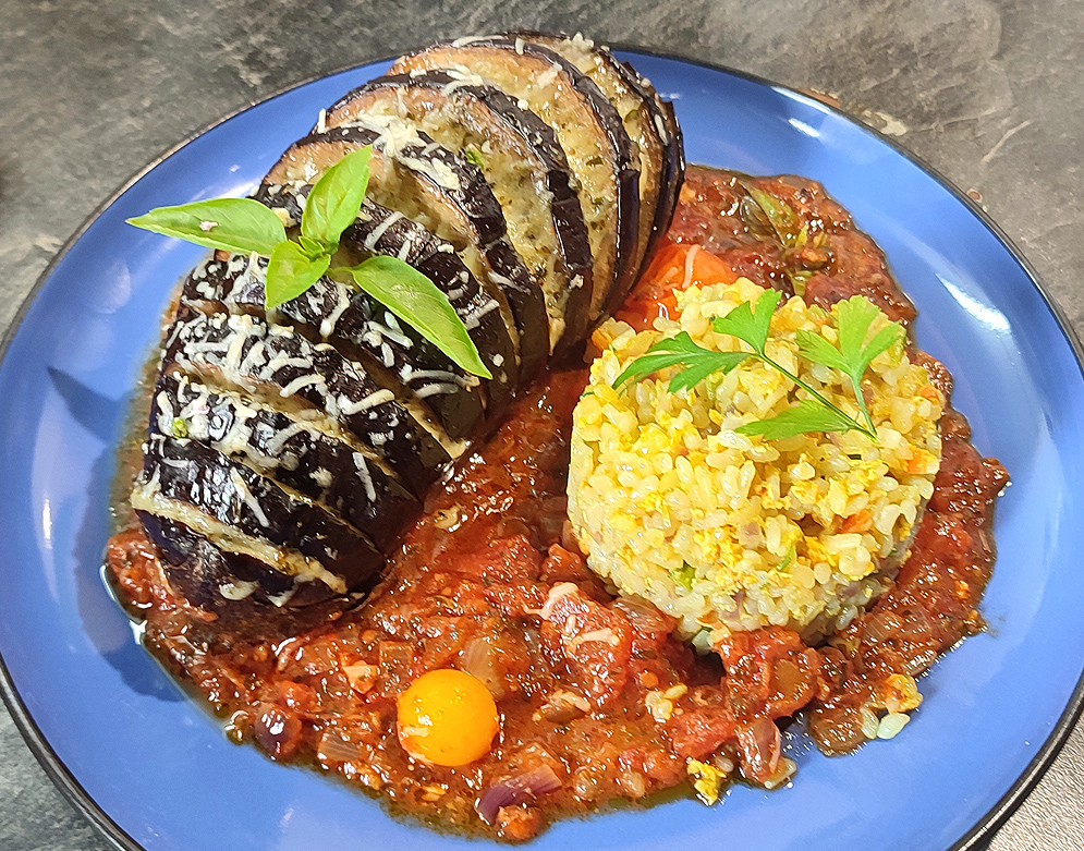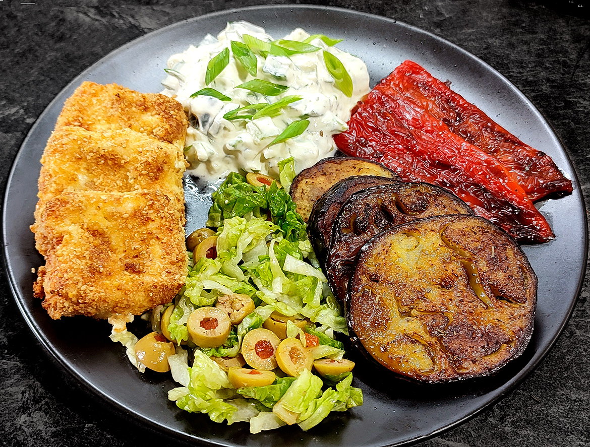Die Zutaten für die Panierstraße sind oben in der Liste schon sortiert. Heute besteht sie nur aus zwei Tellern. Das verklepperte Ei sollte gut überwürzt sein, das muss für die ganze Aubergine mit reichen. Alternativ kann man natürlich auch diese selbst würzen.