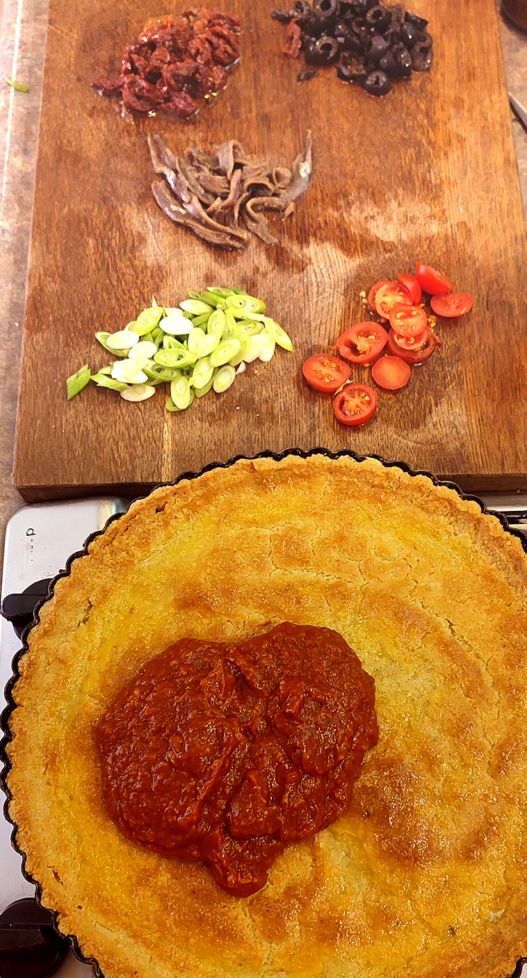 Zu einer glatten Masse verrührt, streiche ich sie in die Tarte-Form und ziehe den Rand, so hoch ich kann.