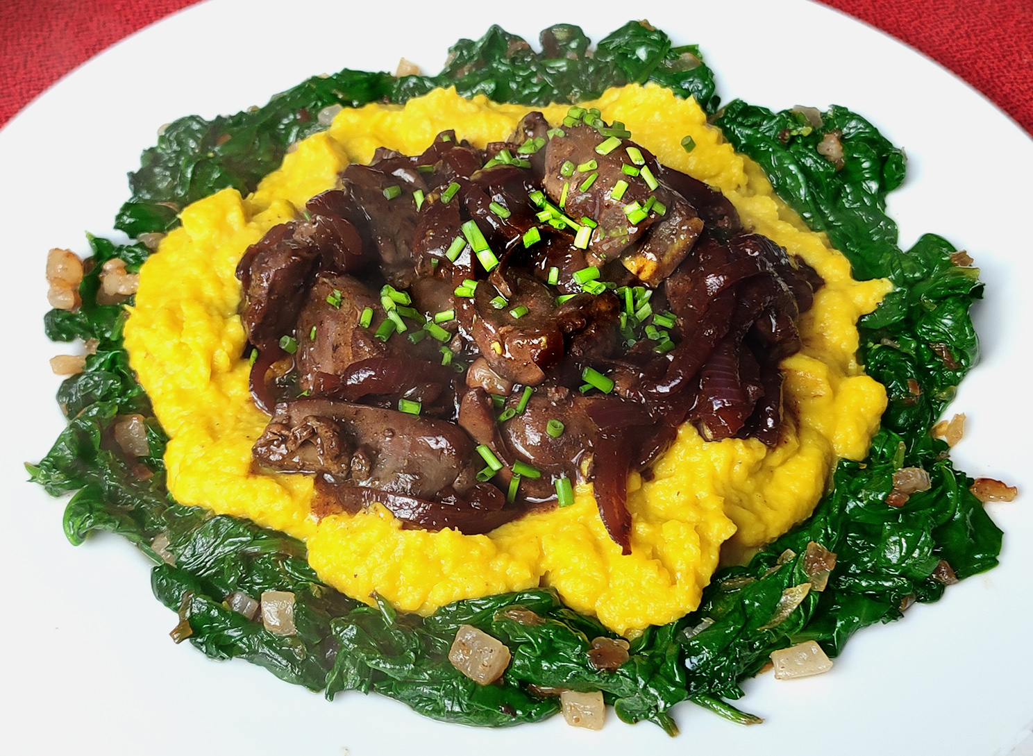 In etwas Butter brate ich die klein gewürfelten Zwiebeln und den ebenso feinen Speck an. Der Spinat kommt hier erst kurz vor dem Anrichten, gut ausgepresst und somit entwässert, mit Muskat und Salz hinzu und wird kurz aufgewärmt.