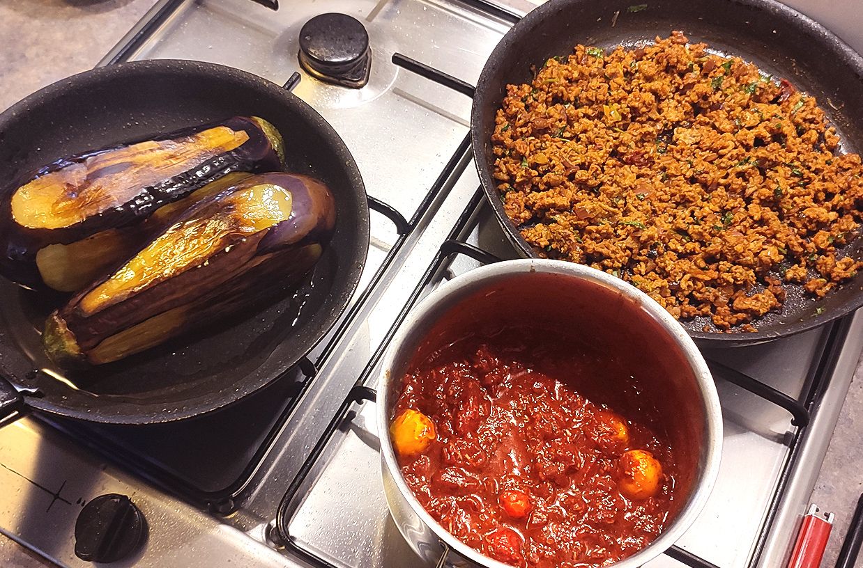 Die Auberginen bekommen einen Zebraschnitt. An vier Seiten schneide ich eine Bahn von der Haut weg, erhitze nicht zu wenig Olivenöl in der Pfanne und lasse sie von allen vier Seiten gut Farbe annehmen.