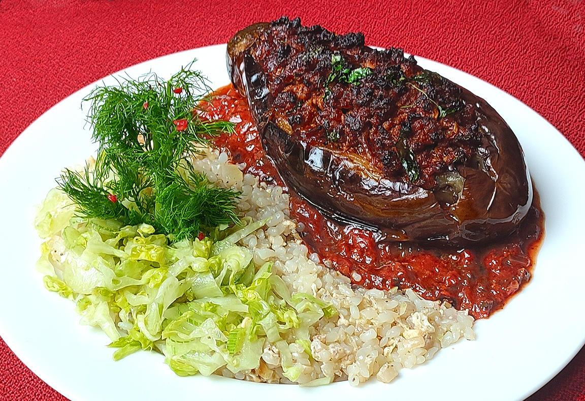 In eine Auflaufform gebe ich die Tomatensauce, setze die Auberginen darauf, schlitze sie von oben auf und salze sie. Dann befülle ich sie mit der Hackmasse.