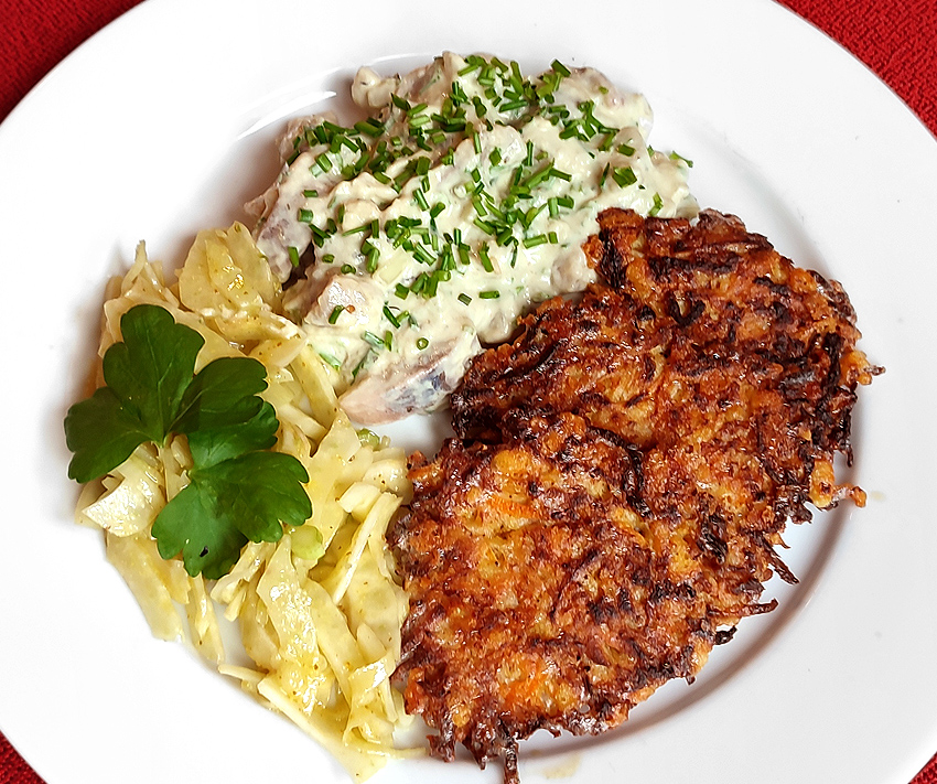 @ Matjeshappen mit Pastinaken-Möhren-Puffer und Fenchelsalat