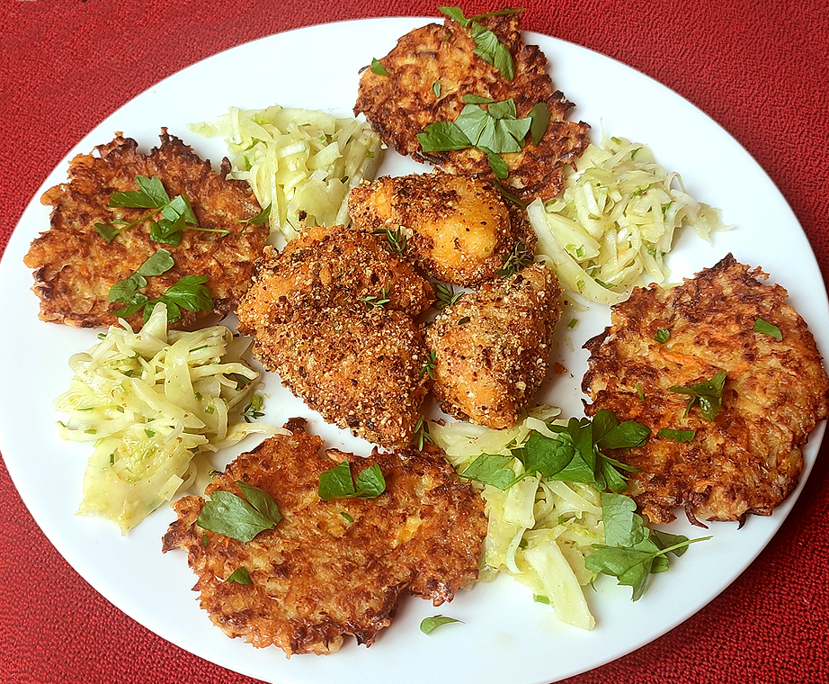 @ Panierte Käseecken mit Pastinaken-Möhren-Puffer und Fenchelsalat