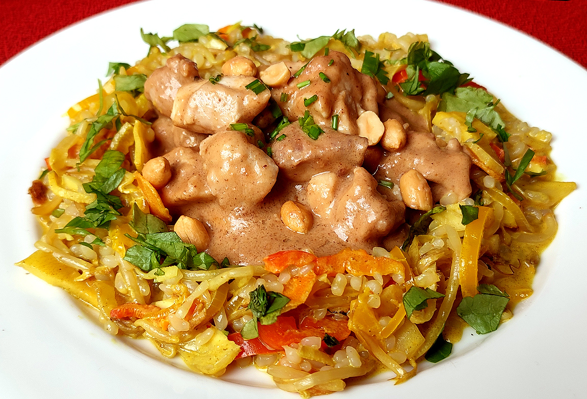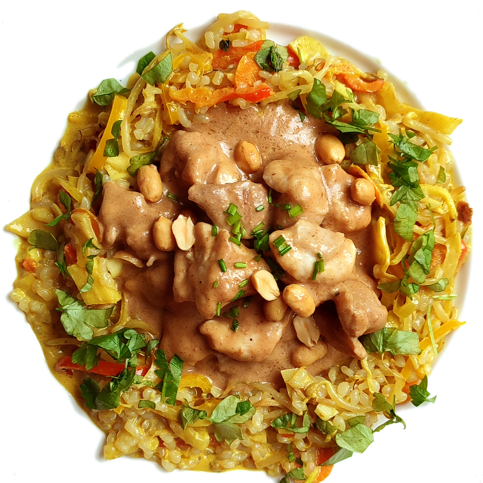 Zwiebeln glasig braten, Allulose und etwas Weißwein dazugeben, einköcheln und leicht karamellisieren lassen. Dann die Brühe dazugeben und weiter köcheln lassen. Abschmecken mit Sojasauce, Salz und Pfeffer, eindicken mit einer Messerspitze Xanthan. Kurz vor dem Servieren die Hähnchenstücke in der Zwiebelsauce erwärmen.