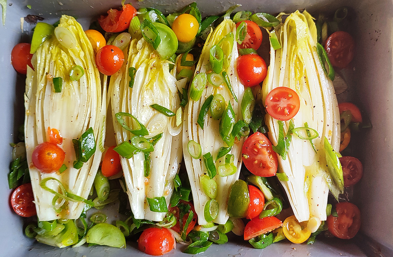Zur Tarte gehört immer auch ein Salat. Der ist heute bunt, na ja, eher zweifarbig, und freut sich auf eine Vinaigrette aus