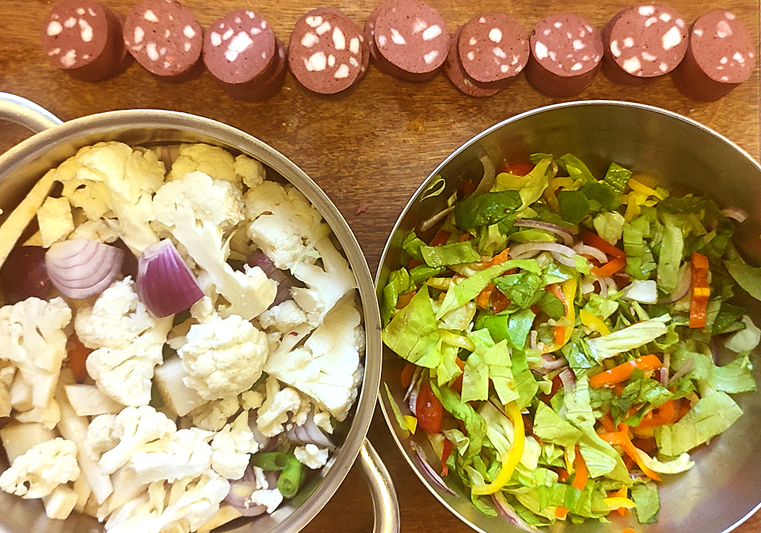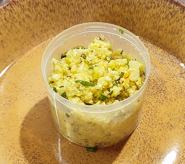 Was mache ich mit dem Blumenkohl? Die Mischung mit dem Konjak-Reis war neulich lecker, also schreddere ich den Kohl. Ups, ist schon ’ne Menge geworden und muss gar kein Konjak-Reis mehr bei.