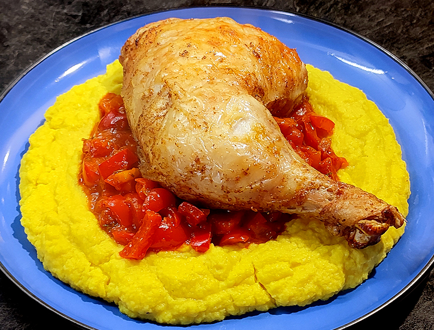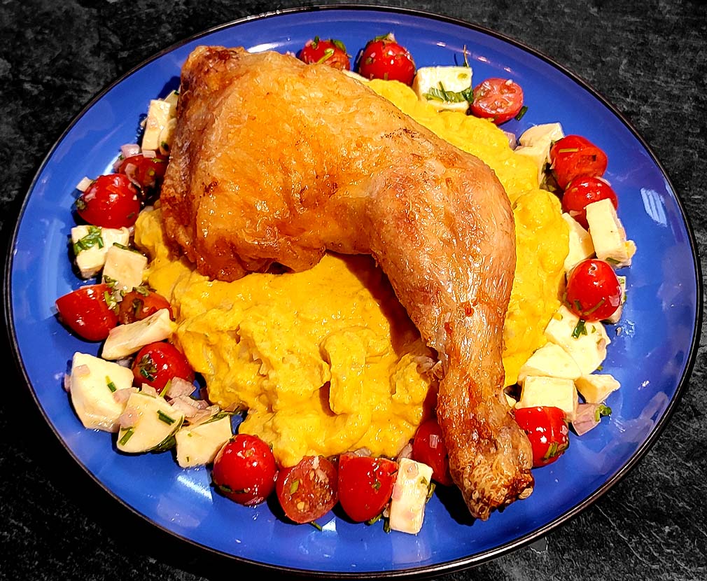 @ Hähnchenkeulen, Paprika-Carpaccio, geschmorte Zwiebeln und Salat