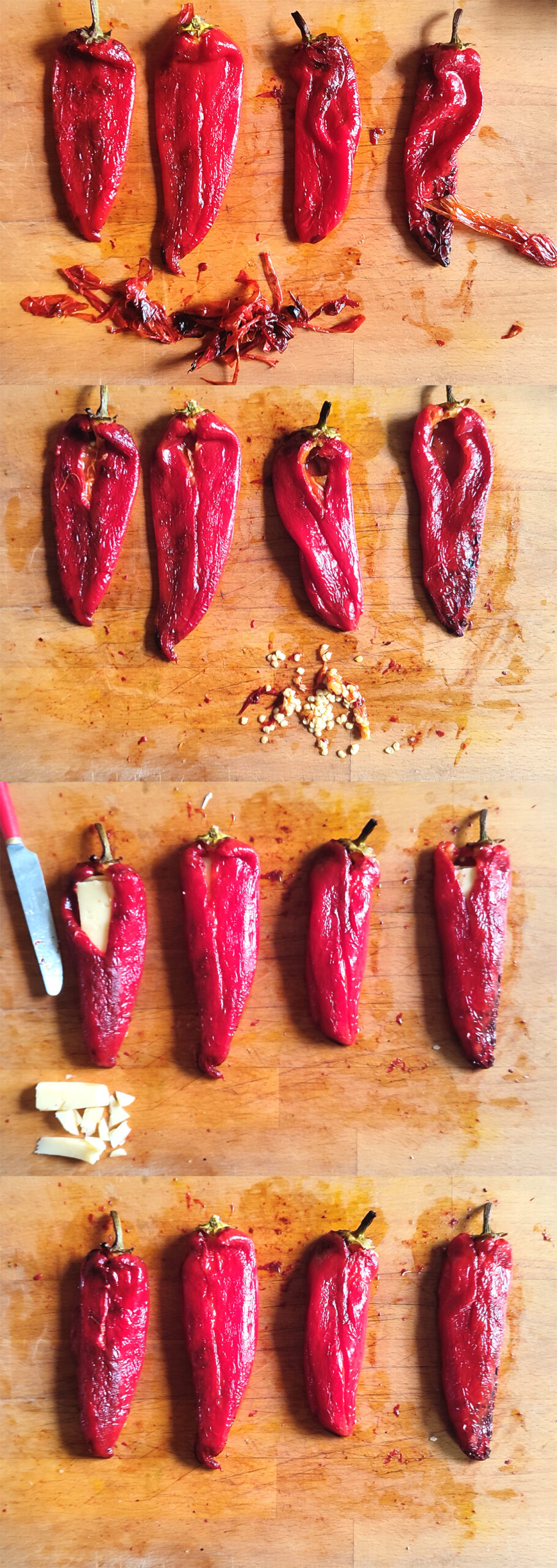 Das gibt mir die Zeit, die Paprikas zu häuten. Strunk abschneiden, Paprikas hälfteln, die Kerne mit dem Messerrücken herausstreichen und die Haut abziehen.