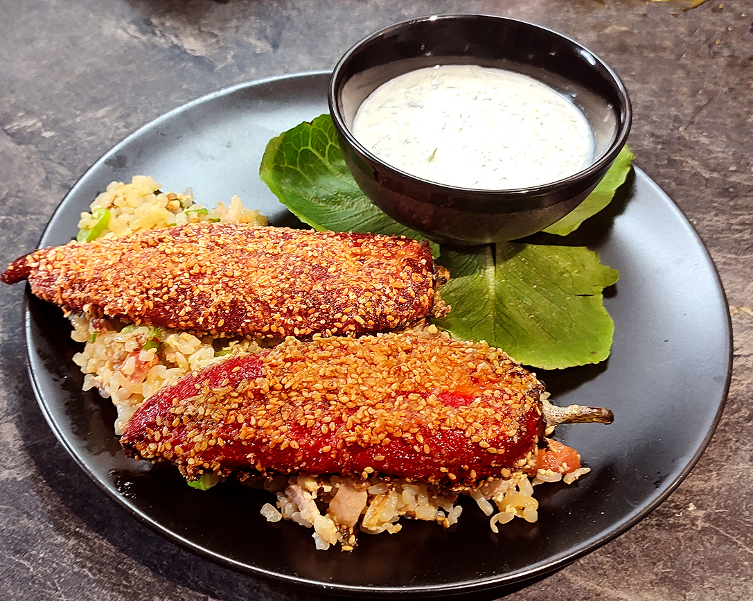 Rote und grüne Spitzpaprika etwas erhöht in die Heißluftfritteuse legen und 10 Minuten grillen, dann umdrehen und weitere 5 Minuten grillen. Wer es im Ofen machen will: möglichst heiß unter dem Grill solange rösten, bis die Paprika deutlich schwarze Stellen aufweisen.