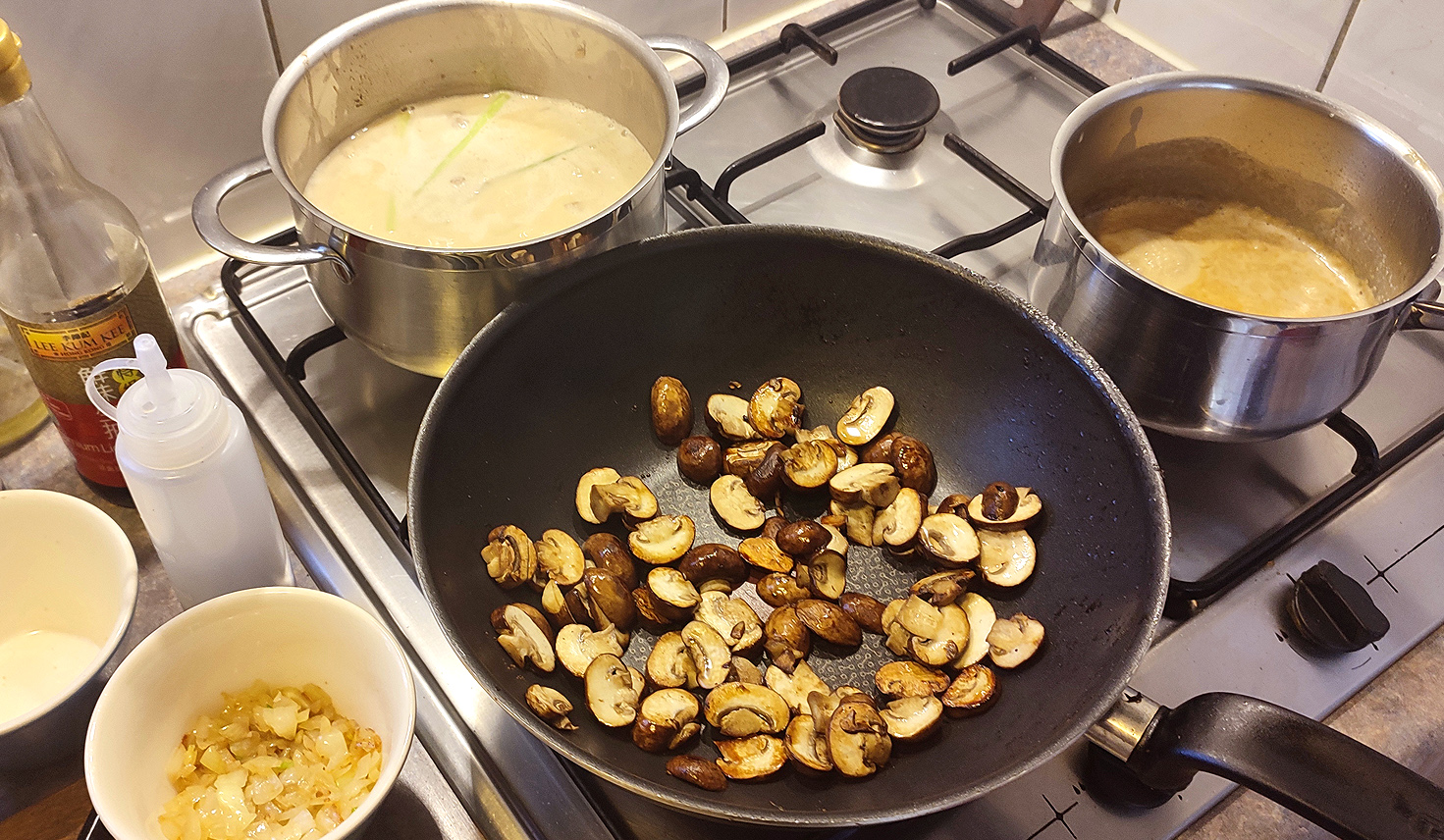 Die Pilze habe ich recht fein gehackt und in einer großen Pfanne ohne Öl ausdünsten lassen. Haben die Farbe angenommen, kommen eine kleingehackte Zwiebel (oder Schalotte) und etwas Öl hinzu und alles brät bis zur gewünschten Farbe weiter.