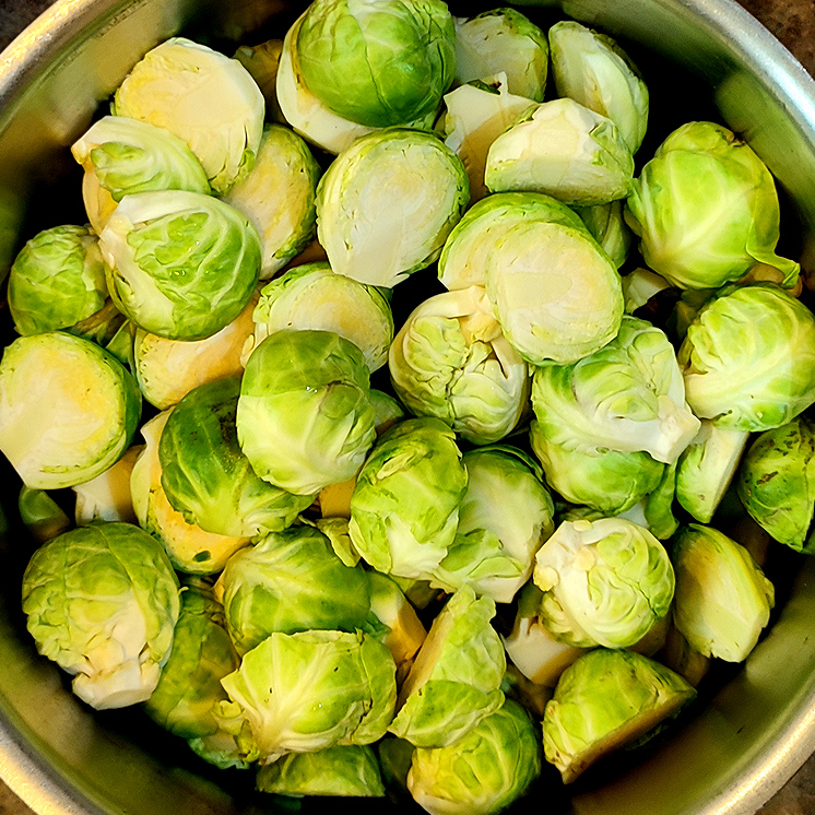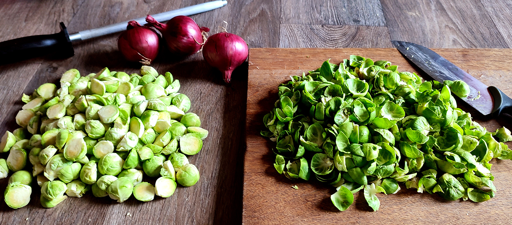 Den Rosenkohl putzen. Ich habe den Strunk und recht viel Blätter abgemacht und die Köhler halb geschnitten.