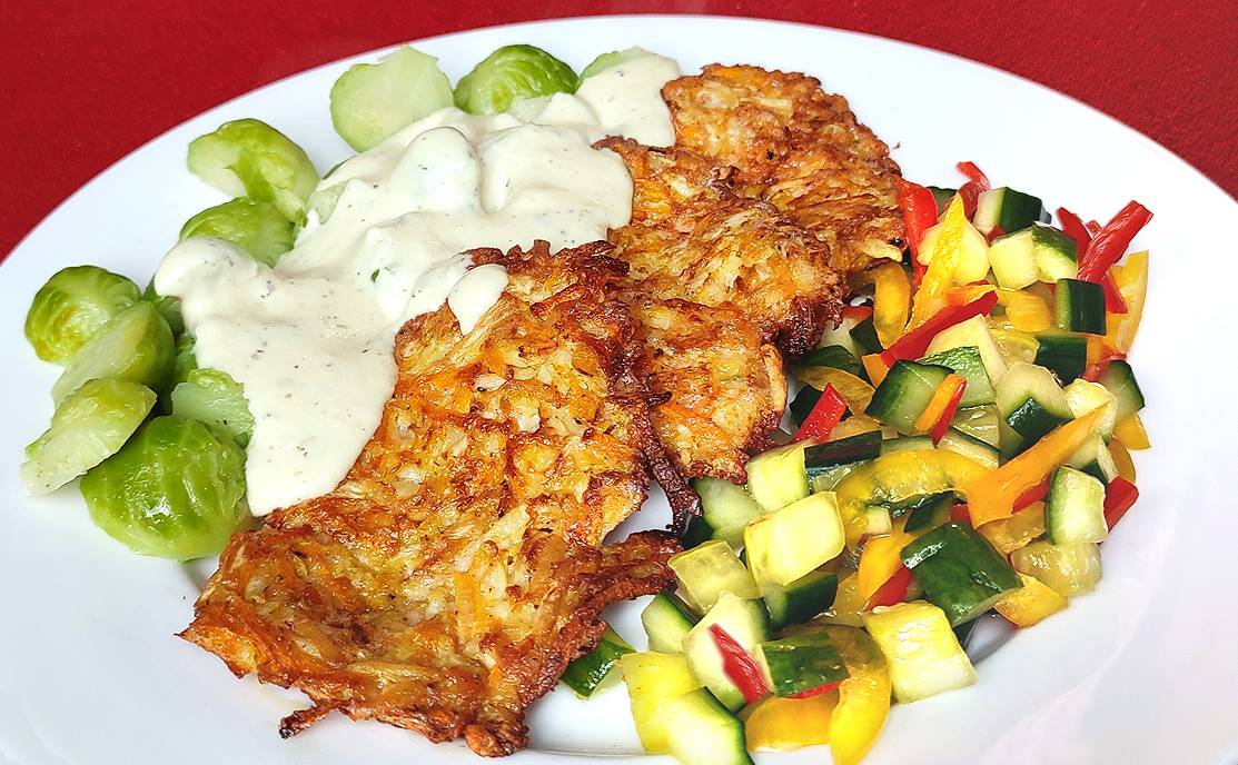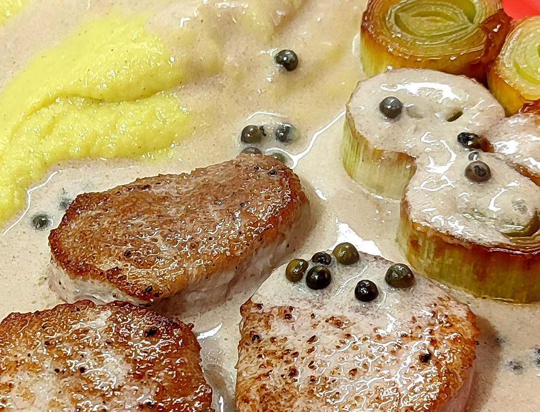 Außen kross und innen saftig weich zeigt sie sich hier von der besten Seite. Fast noch wäre es ein vegetarisches Gericht geworden. Ein, zwei Schweinekrüstchen in der Panierung haben das gerade noch verhindern können (-:
