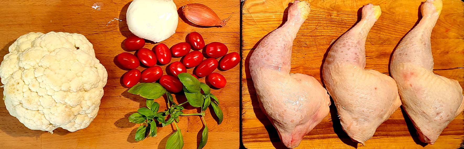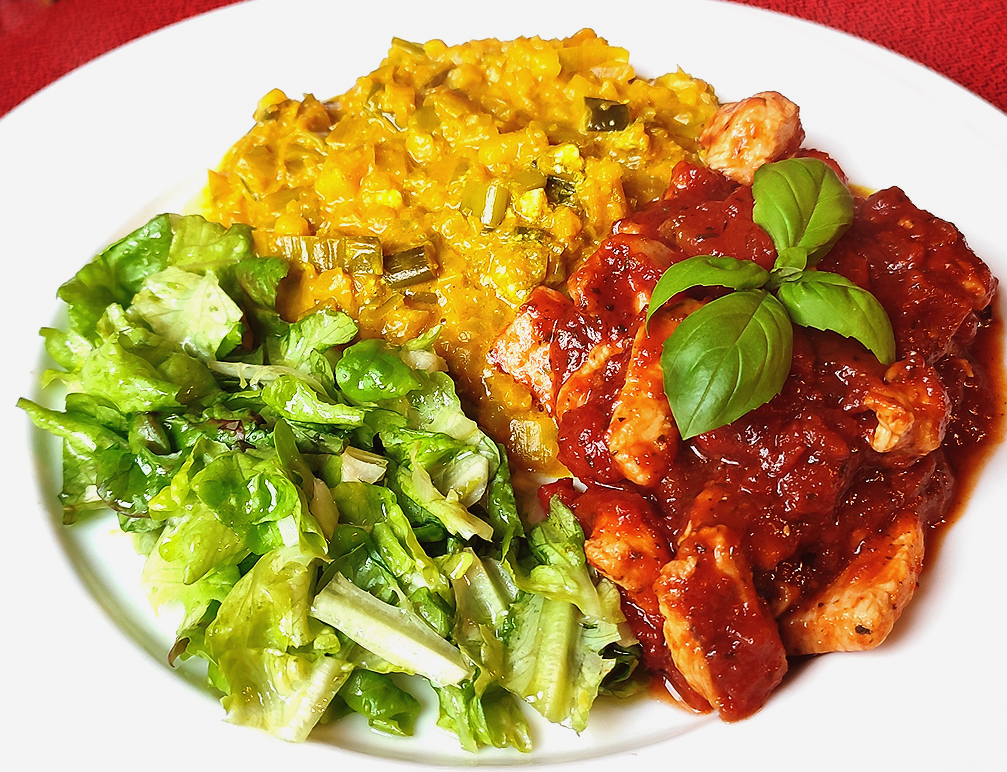 @ Huhn in Tomatencurry mit Blumenkohl-Lauch-Risotto und einfarbigem Tricolore-Salat