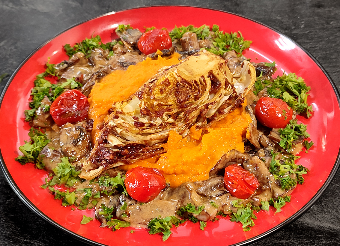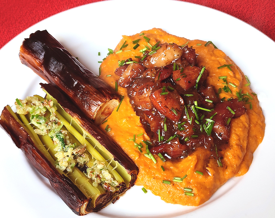 Dazu habe ich noch ein paar Spalten von roten Zwiebeln angebraten, mit Allulose versetzt und in etwas Weißwein karamellisieren lassen. Noch etwas Brühe drauf , einkochen lassen und abschmecken.