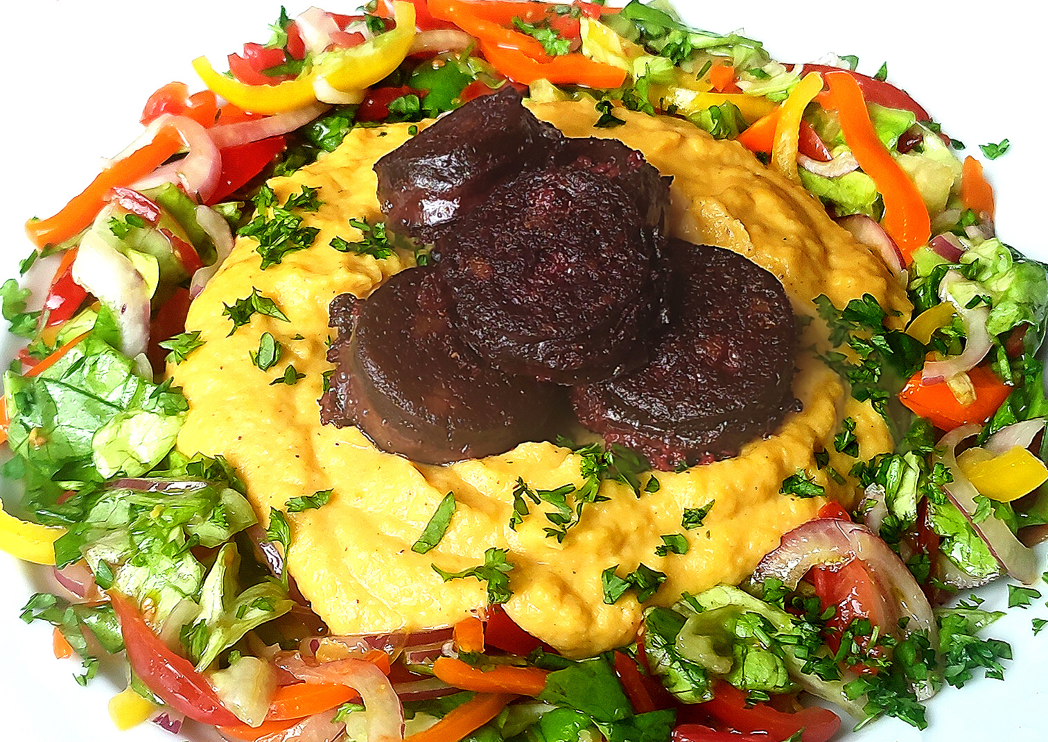Das ist lecker, wenn man sich so von außen, über den knackig-sauren Salat, zum warm-weichen Püree durcharbeitet und zur Belohnung dann die umami-krossen Blutwürste erreicht. Wie man schon ahnte, liebe ich diese Anrichteweise, wo die Zutaten zwar getrennt auf dem Teller liegen, aber dennoch dazu verführen, auch mal alle Komponenten auf einmal auf der Gabel zu haben.