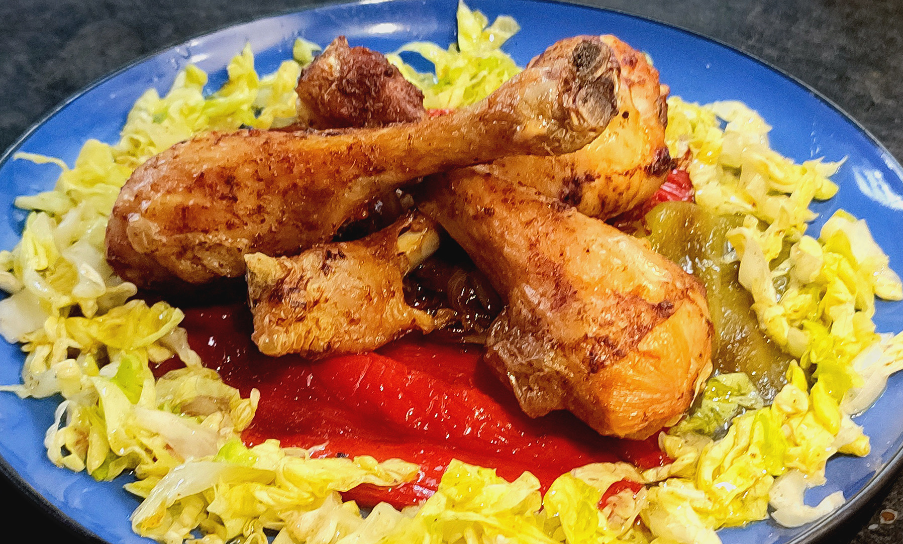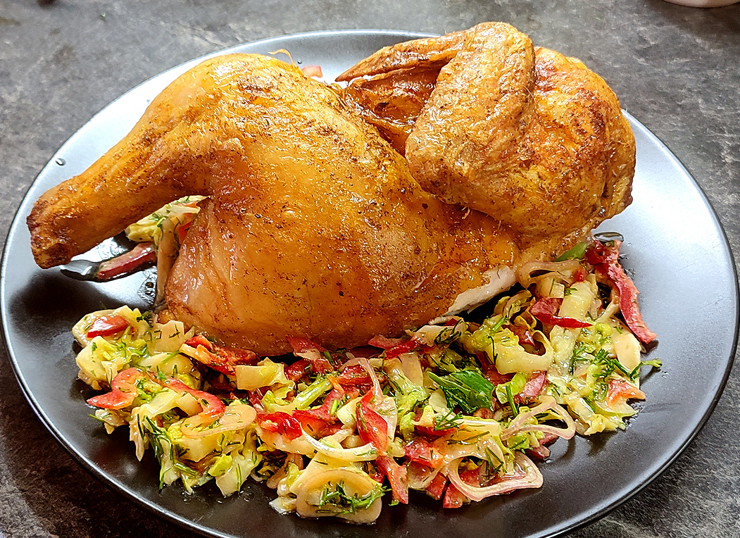 Superlecker. Während man an der Keule nagt, muss man keine Angst haben, dass der Rest kalt wird, der ist schon kalt. Paprika und Salat sind aber auch eine schmackhafte Abwechslung zum saftigen Hühnchenfleisch.