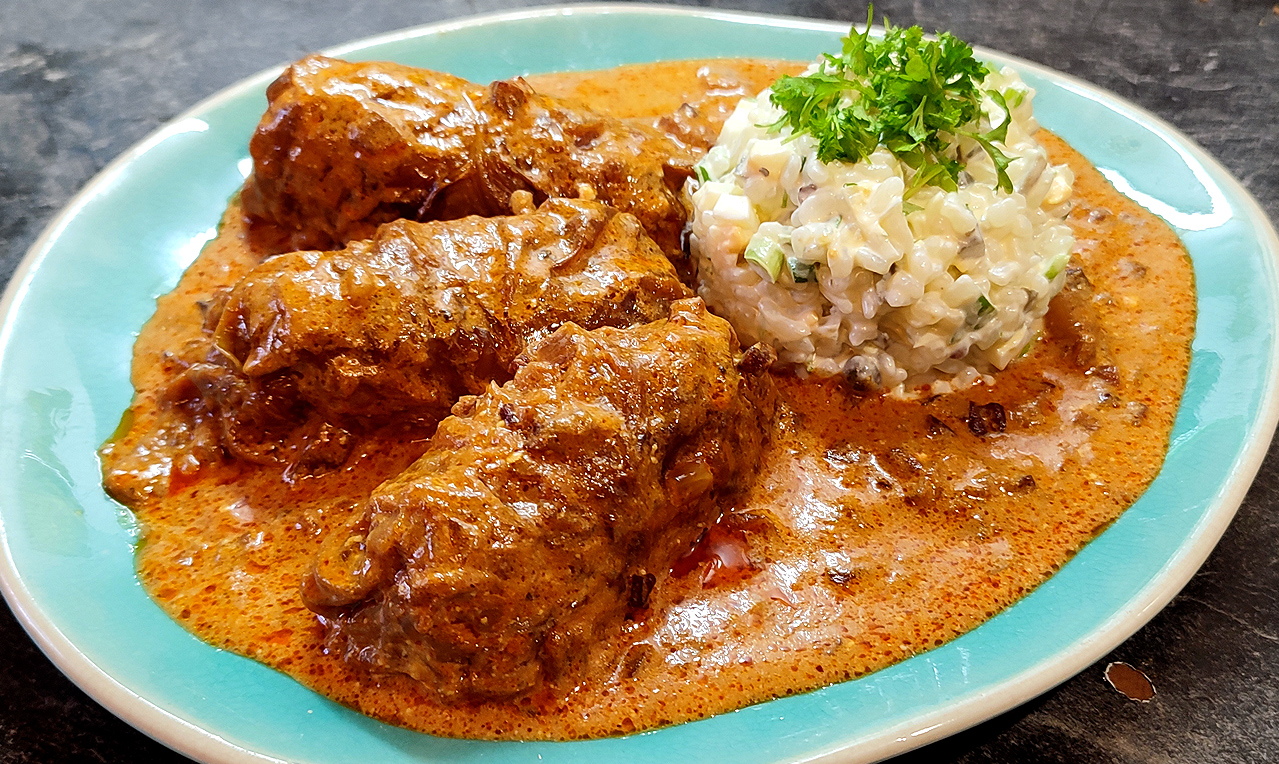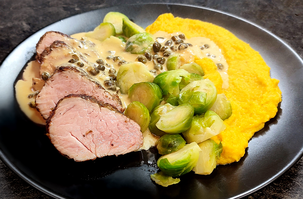 Dazu gibt es Röllchen vom Kassler und eine kräftige Hollandaise.
