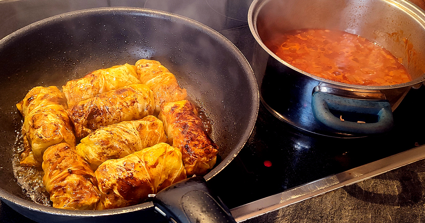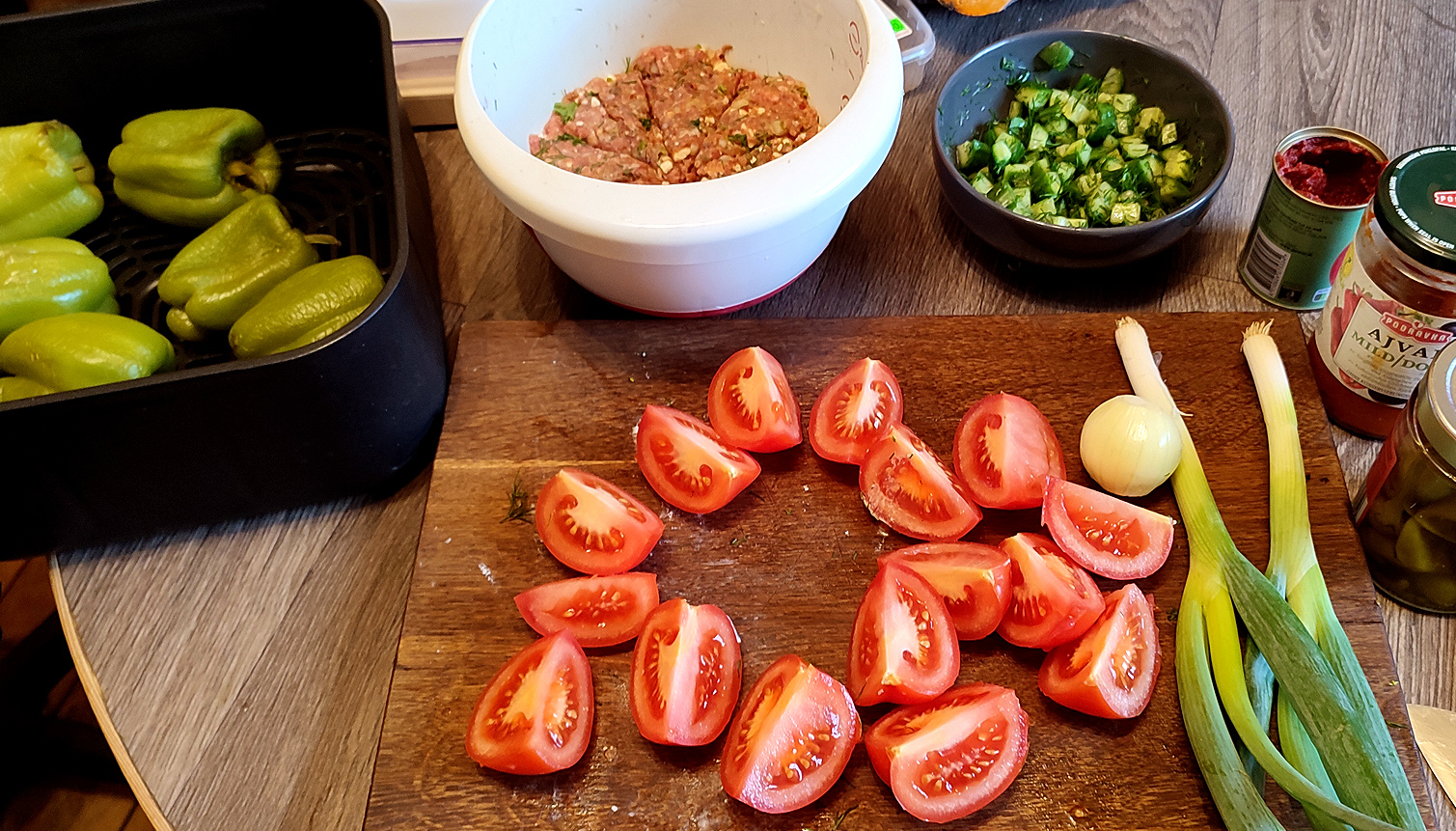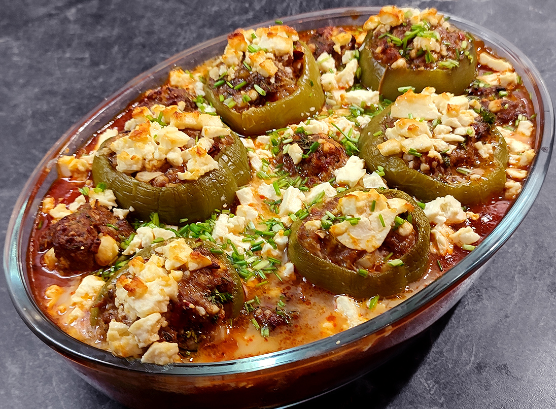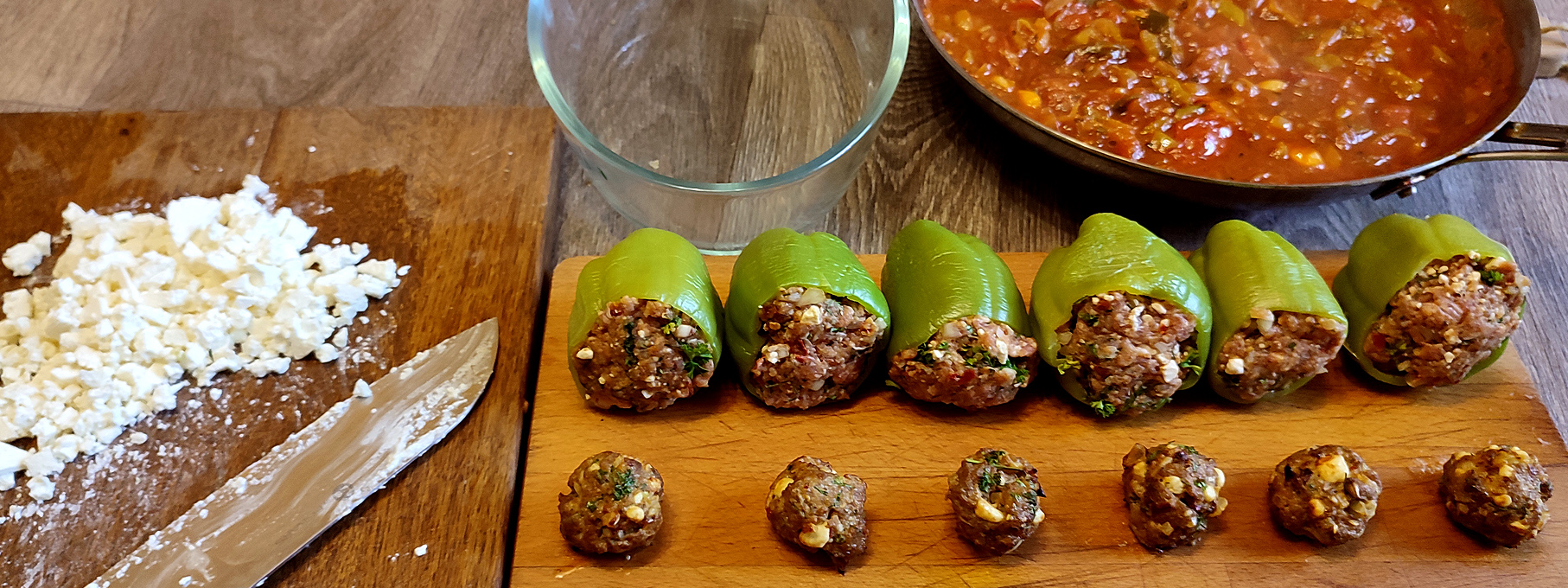 Sie sind kleiner und blasser, diese grünen Paprikas, die die Importabteilung so gerne isst und die ich im Laden eher links liegen lassen würde. Sie sagt auch, ich solle da sonst gar nichts dranmachen, „einfach Hack, die kleinen grünen Dinger, Schafskäse drüber und fertig“.