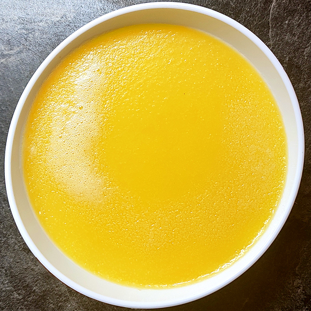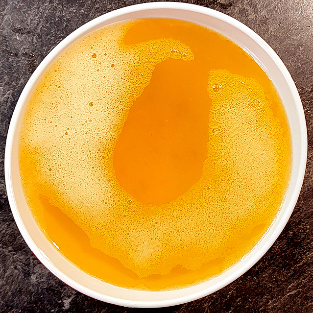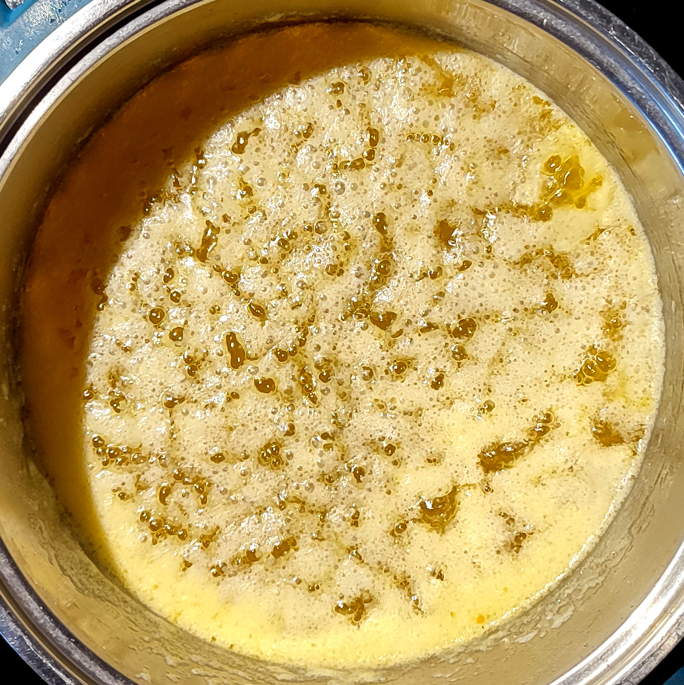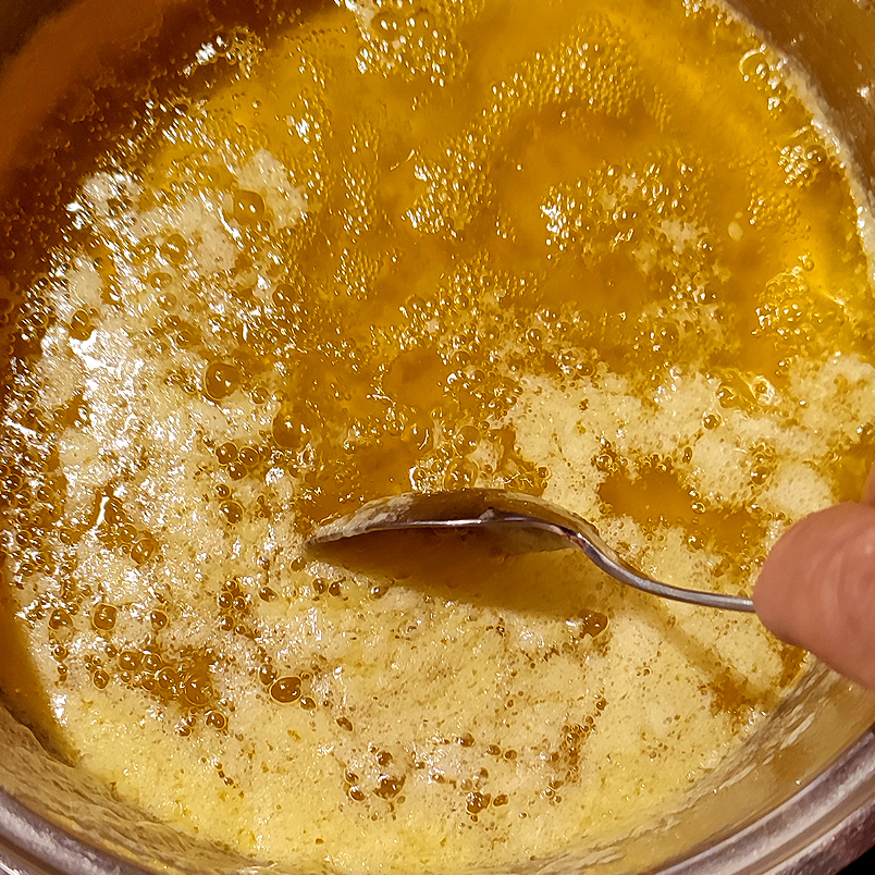 Hat die Creme eine gewisse Festigkeit, kommt der Topf aus dem Wasser und unter weiterem Rühren wird die zerlassene Butter hineingegeben. Die darf nicht zu heiß sein. Ist sie aber nicht, wenn man meine Reihenfolge der Zubereitung einhält.