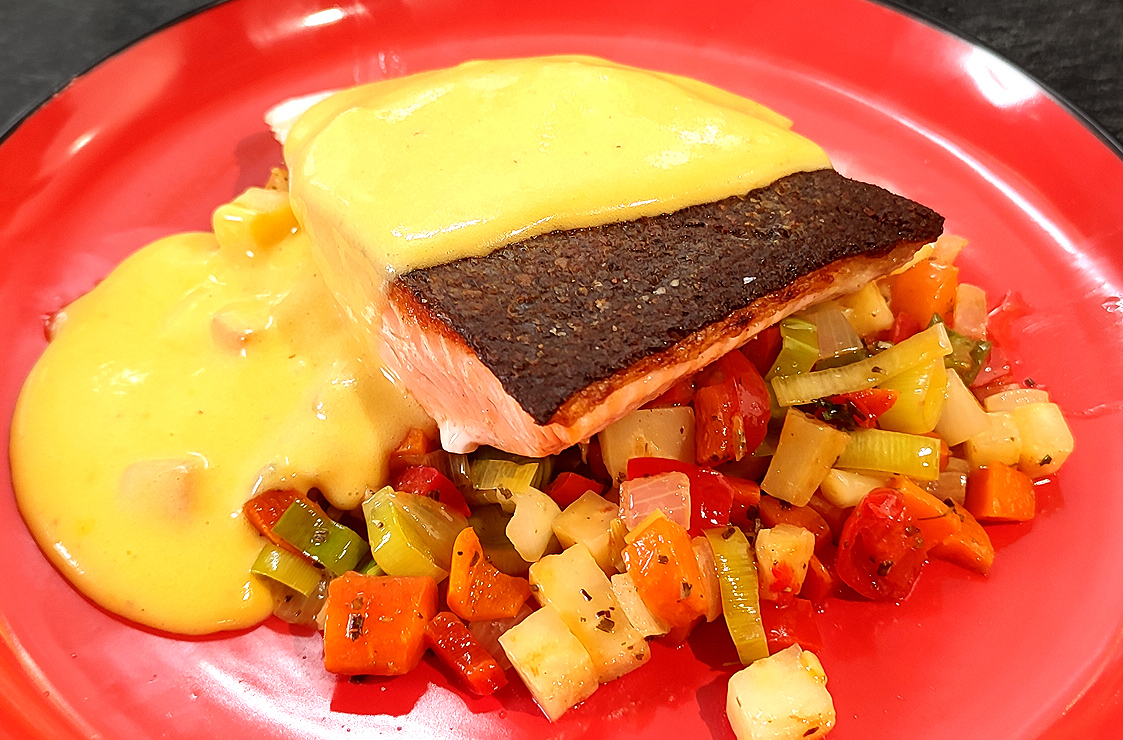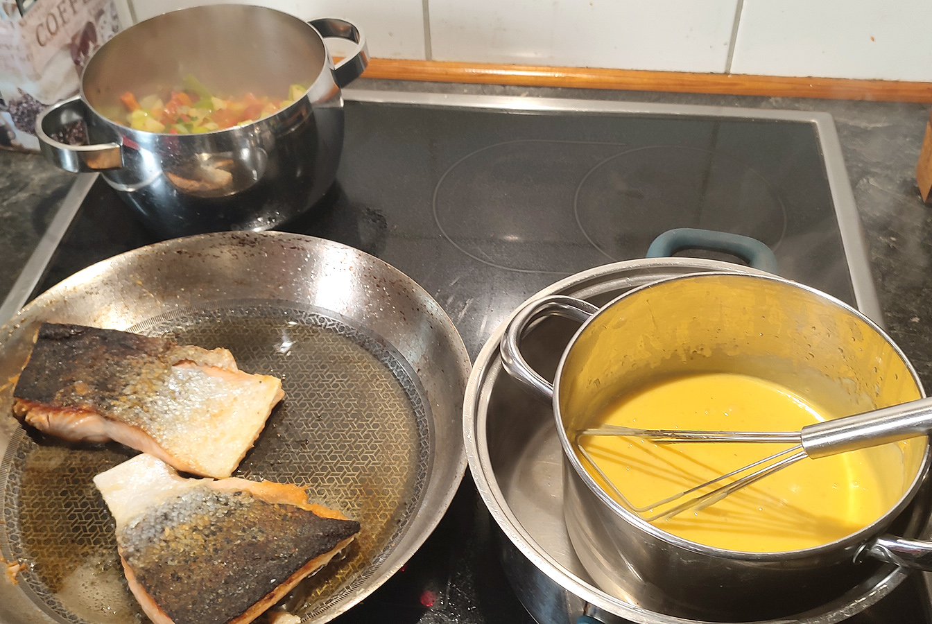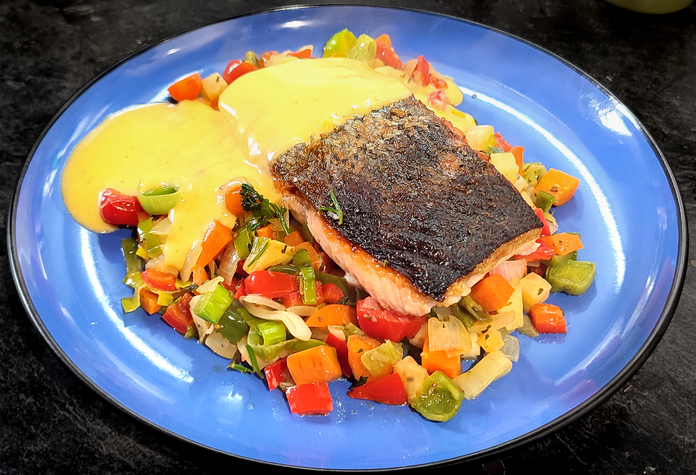 Stelle den Topf in das noch heiße Wasser und schlage die Sauce zügig auf. Sie soll cremig schaumig werden. Macht sie Anstalten, zu gerinnen, schnell den kleinen Topf aus dem Wasser und weiterschlagen.