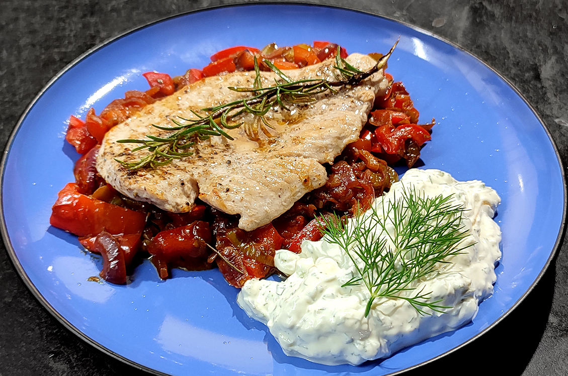 Nachschlag: Das reichte natürlich locker für zwei Tage. Heute, bei sommerlichen 28°, nur noch mit Tsatsiki und Gurken-Tomaten-Salat.