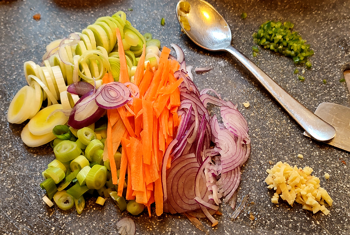 In feine Streifen, bzw. Scheiben geschnitten, kommen dazu