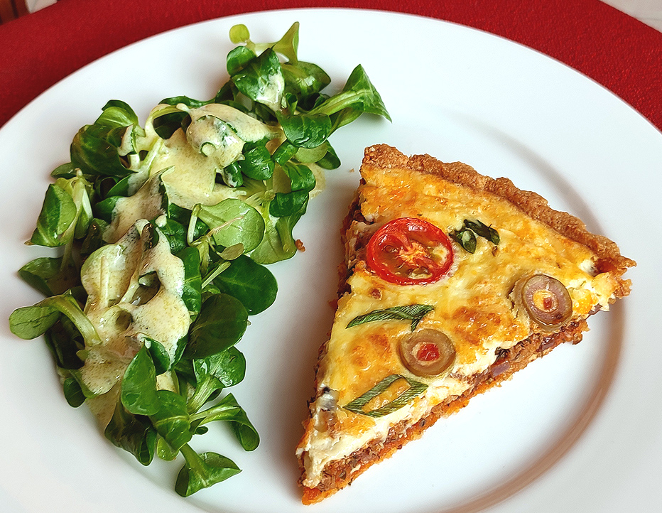 zusammengeknetet und in eine Quicheform gestrichen. Den Boden backe ich dann „blind“ 10 Minuten bei 180° nur mit Unterhitze und weitere 10 Minuten mit Ober- und Unterhitze. Am besten nach Augenmaß, leicht gebräunt.