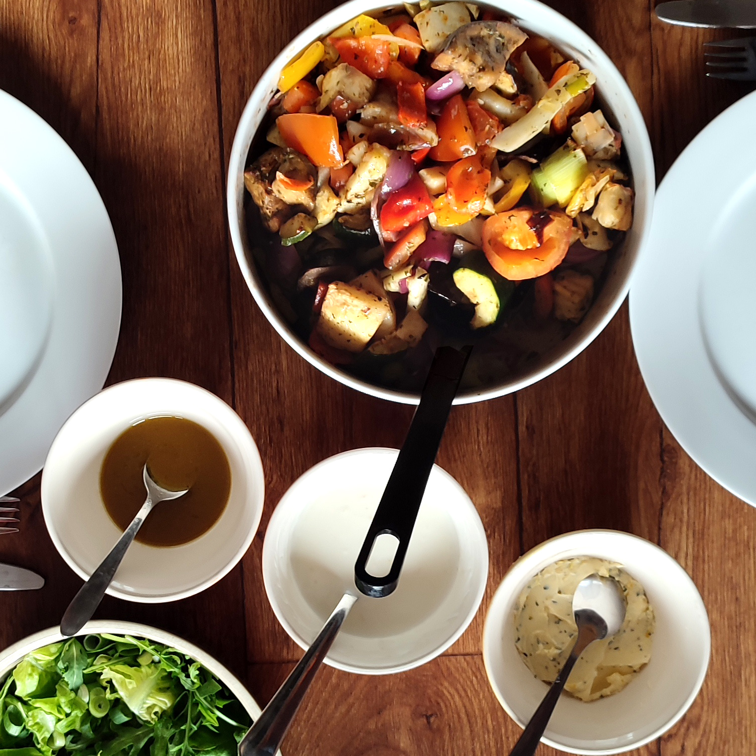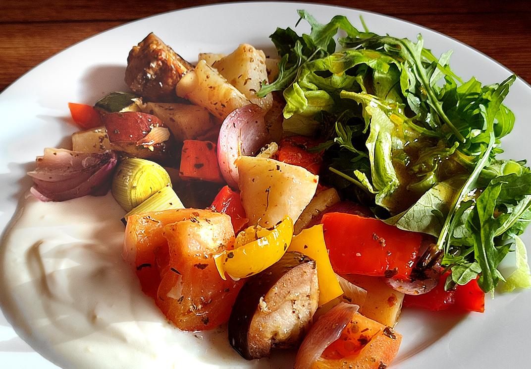 Ofengemüse mit Zitronenjoghurt und Salat