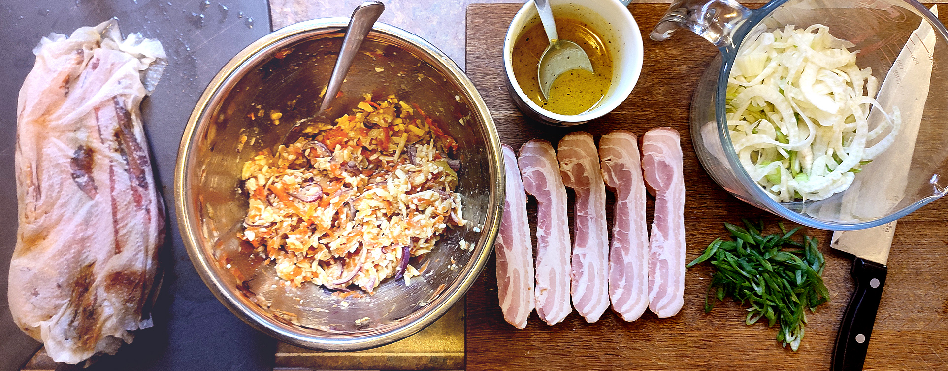 Der Bauchspeck wird in Scheiben nach Gusto gebraten, der Fenchel super fein geschnitten, dadrauf kommen geschnittene Frühlingszwiebeln und eine Vinaigrette aus