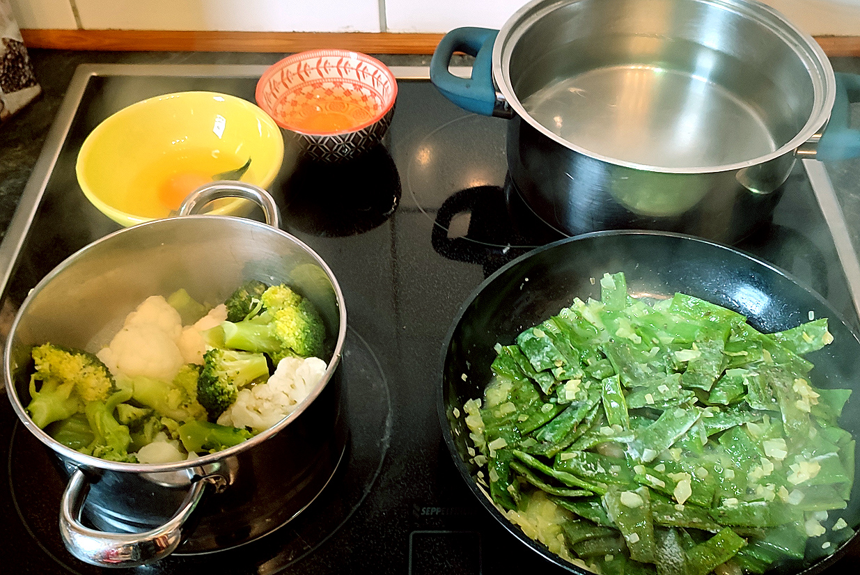 Na, da köchelt es schon munter. Im Hintergrund warten die Eier auf ihr Wasserbad, vorne links bereiten sich Blumenkohl und Broccoli aufs Püree vor und vorne rechts gibt es ordentlich Zwiebeln und Speck an die Bohnen.